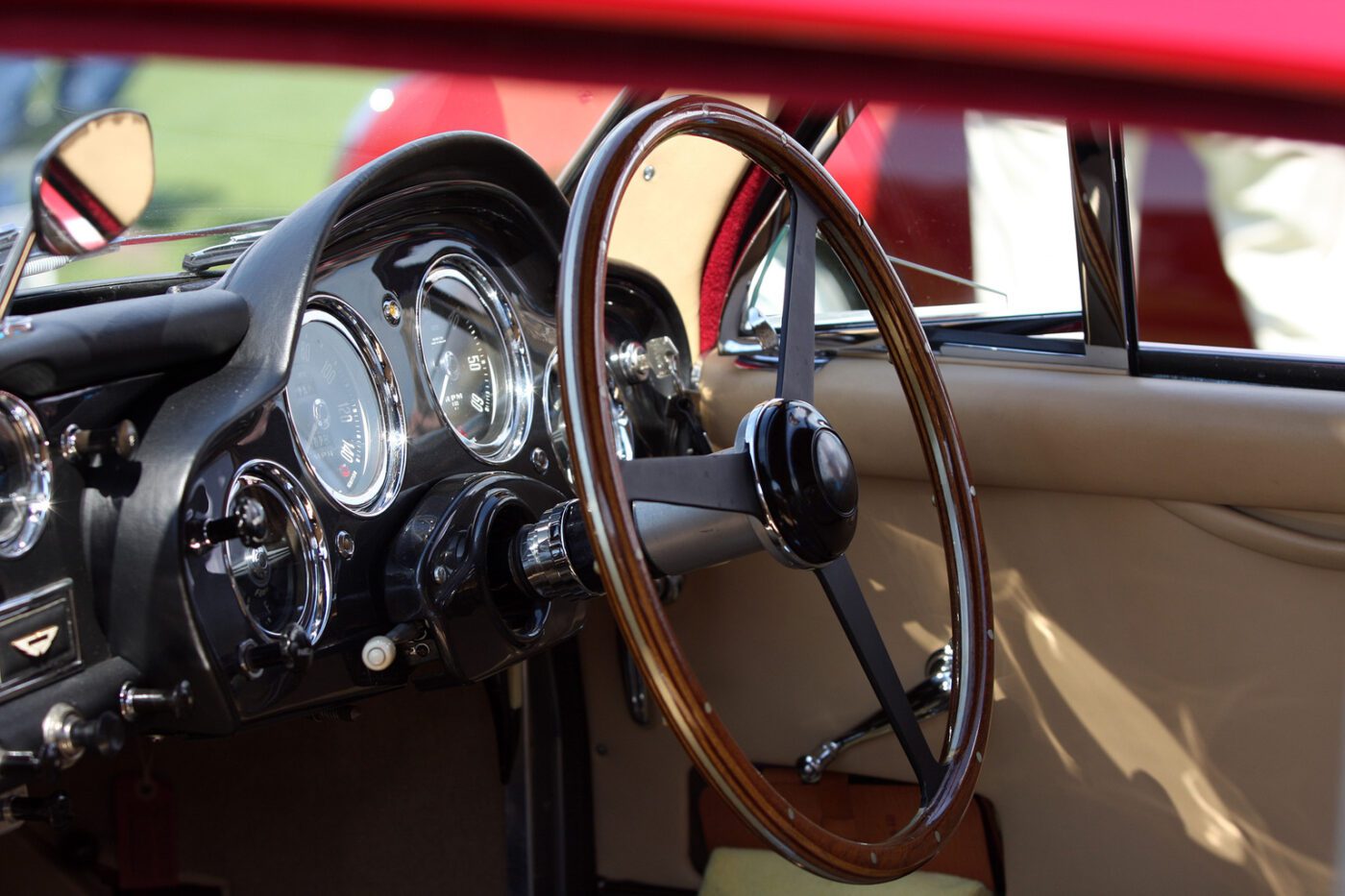 According to a copy of its original build sheet, this original left-hand drive example from 1959 was factory-equipped with a hydraulic brake booster, fully chromed road wheels, polished Alfin rear brake drums and a locking glove compartment lid. It was delivered new via Charles Hornburg to its first owner, Mr. G.A. Irving, of South Gate, California. Today, it retains the matching-numbers engine, numbered DBA/1336, and performance is enhanced by approximately ten percent by the dual-outlet exhaust system. The exterior is finished in burgundy and remains in nice condition. This is an older repaint, however, with some flaws apparent under close examination. The engine bay could benefit from freshening, but it does sport the proper toolbox, which is correctly affixed to the scuttle, and the serviceable tan leather interior is set off by an attractive wood-grain steering wheel.