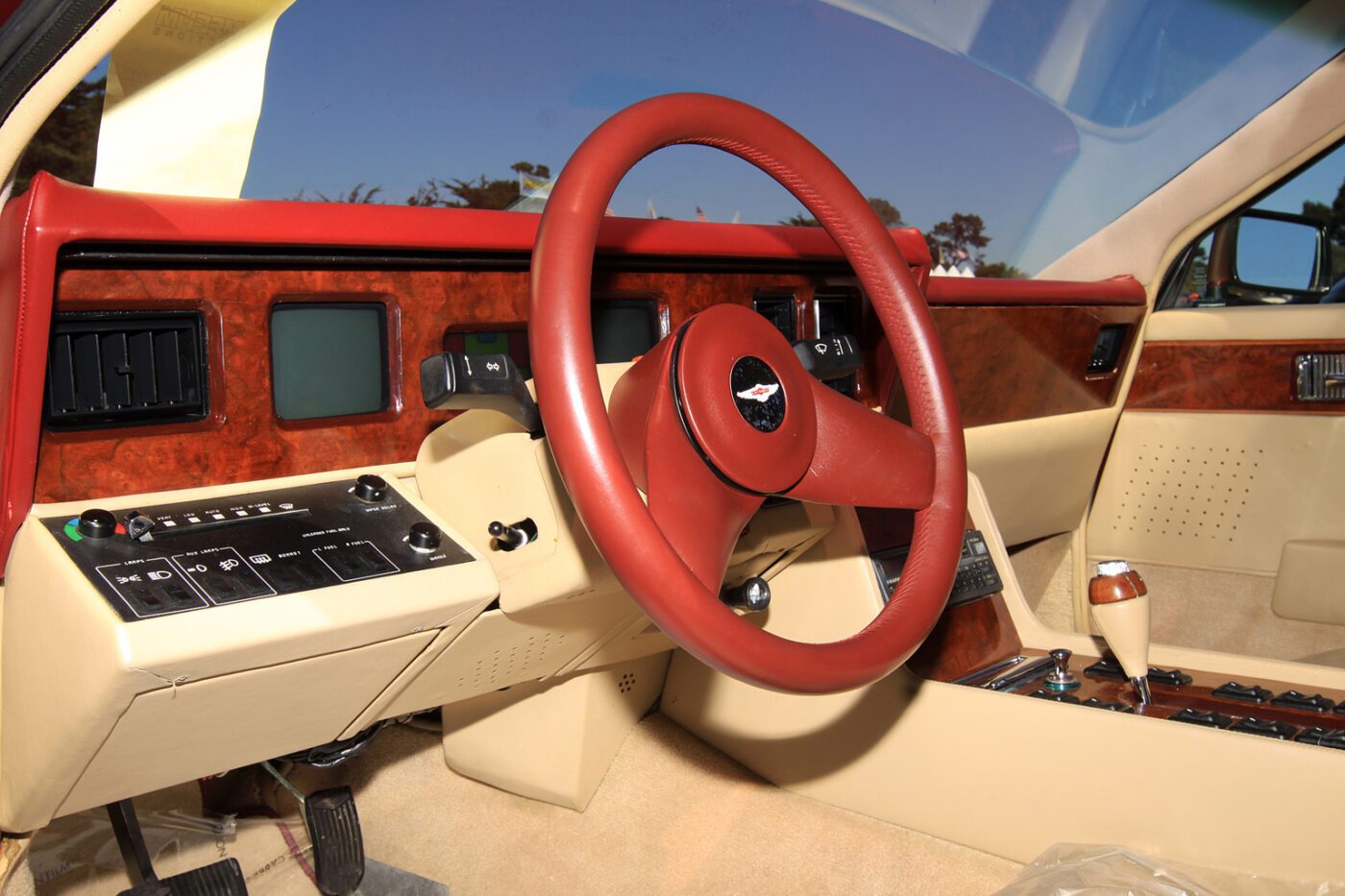 The first car was delivered in 1979 with US sales beginning in 1982. A total of 645 chassis were built before the end of production in 1989. Painted dark blue over tan hides with dark blue piping, this Lagonda boasts new Continental radial tires on factory alloy wheels. It also features the unique-to-Lagonda glass sunroof over the rear passenger compartment. The same is true today as thirty years earlier: the Aston Martin Lagonda continues to make quite a statement about its owner. In this case, it is one of English elegance with modern performance and utter uniqueness. Read more about this car.