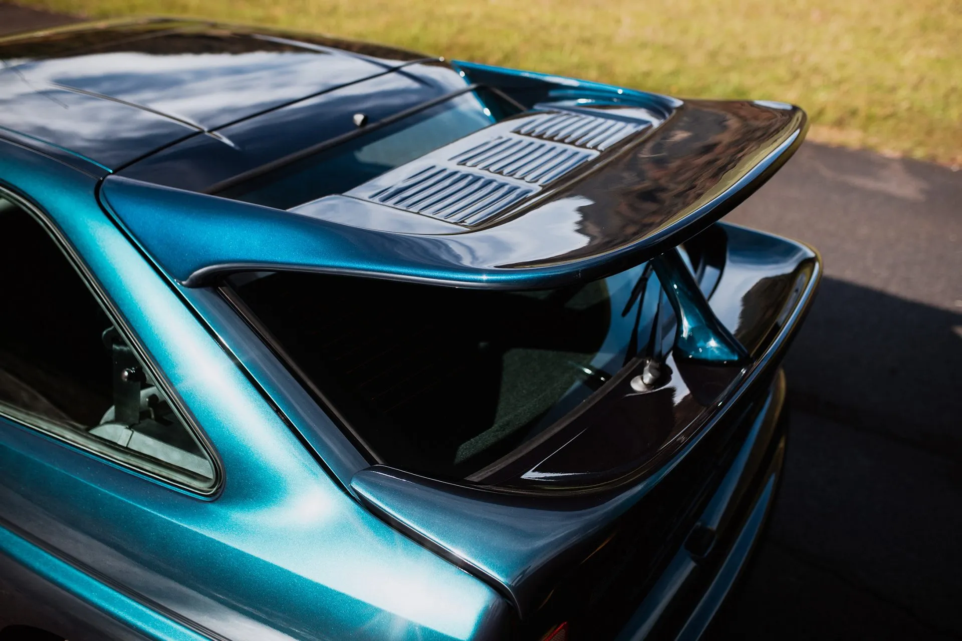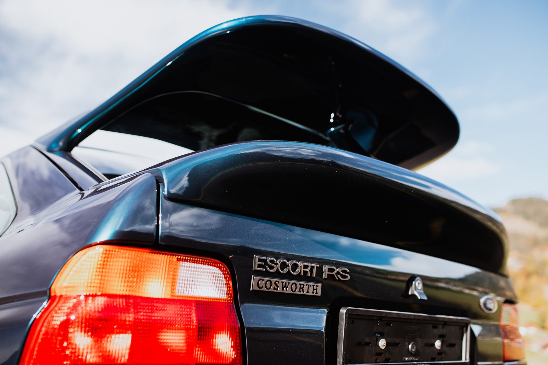The Escort RS Cosworth’s appearance was dominated by that enormous rear wing. The “whale tail” spoiler sat high above the rear deck on aluminum supports, creating genuine downforce at speed. The wing became the car’s defining visual feature.