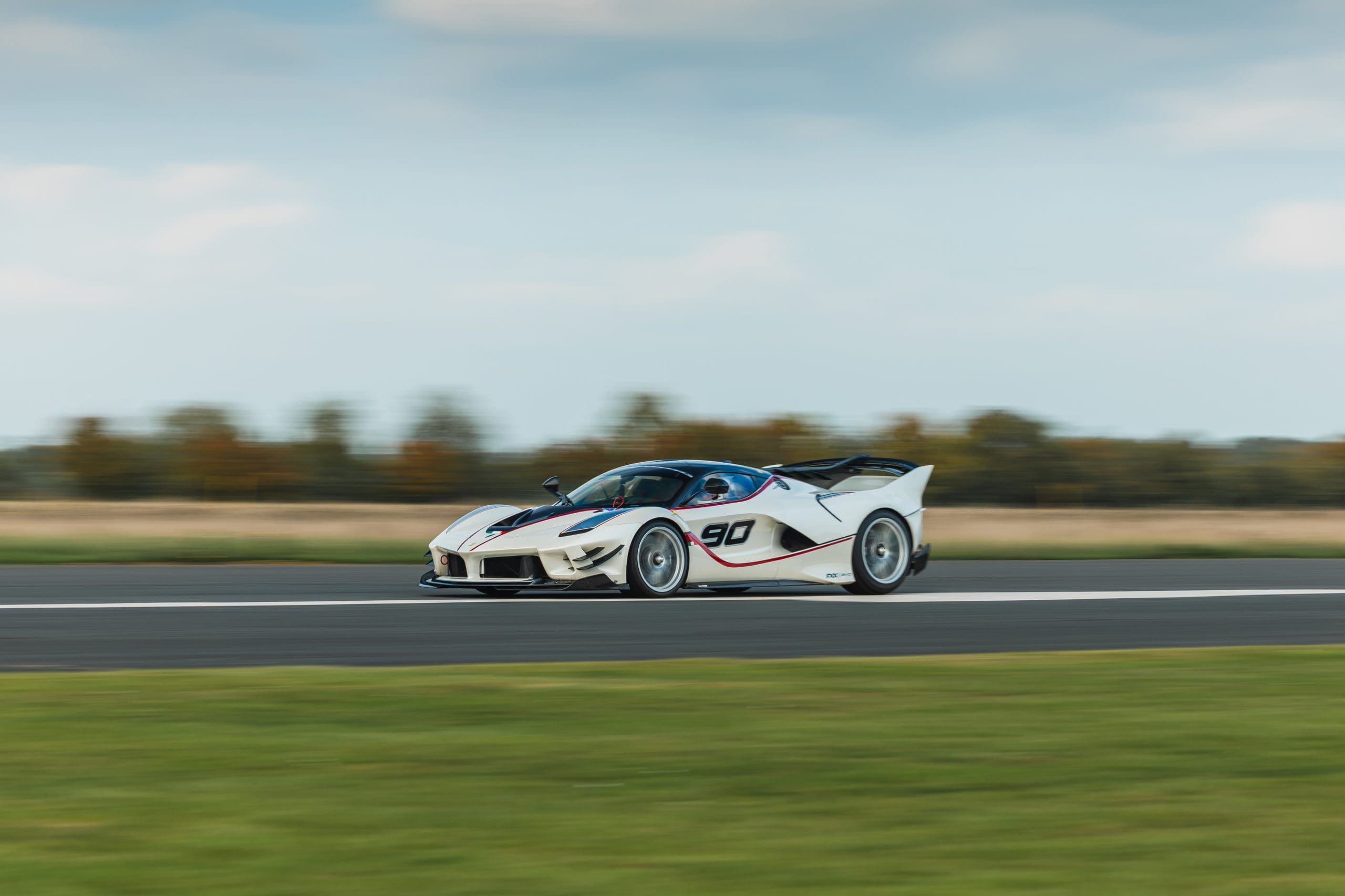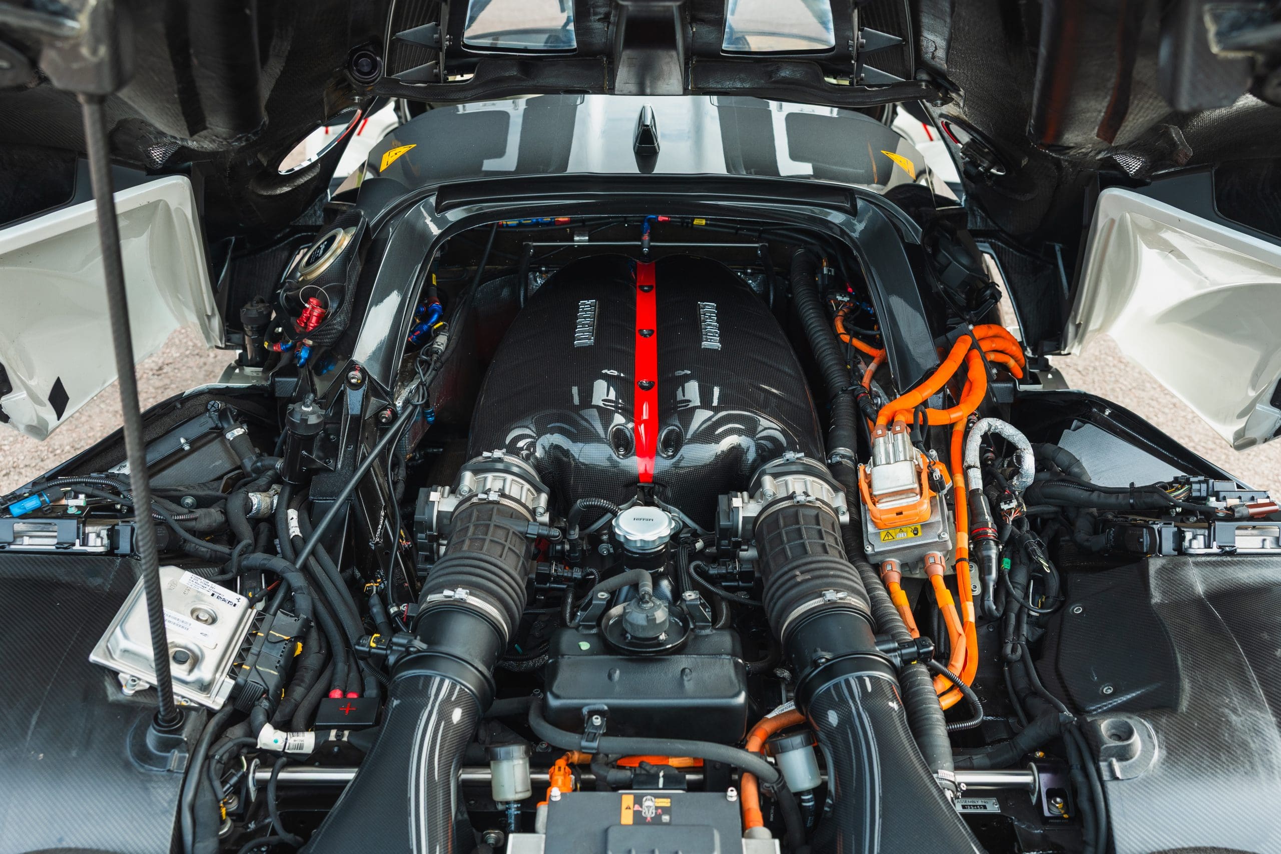 Powered by a 6.3-liter V-12 paired with an F1-derived HY-KERS hybrid system, the FXX-K delivers 1,035 horsepowerโ€”848 from the combustion engine and 187 from the electric motor. Upgrades such as new camshafts, a free-flowing exhaust, and extensive aerodynamic revisions enhanced both power and handling. Its redesigned bodywork and lightweight construction generated 50% more downforce than the LaFerrari, enabling it to lap Ferrariโ€™s Fiorano circuit five seconds quicker.