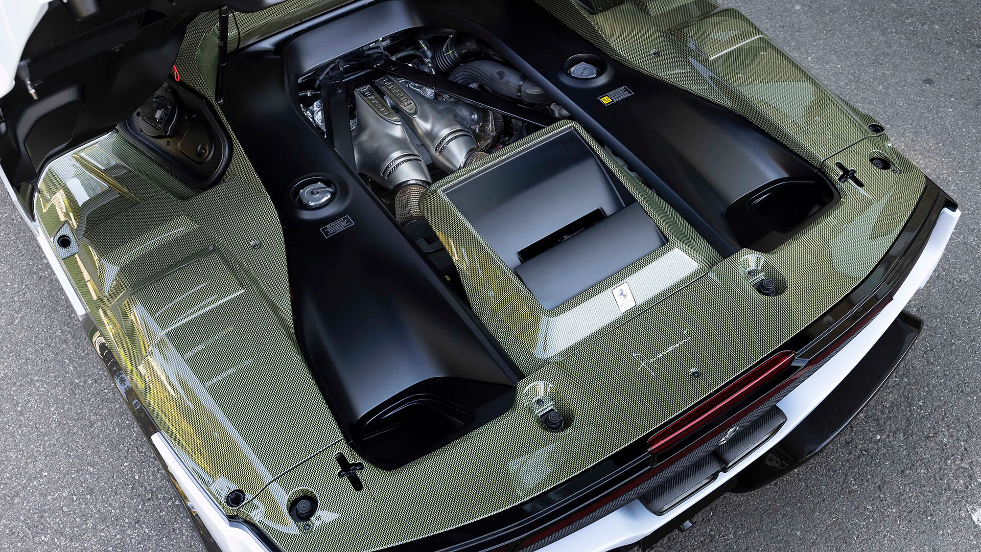 Distinctive smoked Lexanยฎ louvers crown the engine bay, echoing the F40โ€™s iconic rear glass and connecting to lower intakes and side vents. A central titanium exhaust, crafted using additive manufacturing, adds an ultramodern flourish, while the taillights subtly reference the 296 GTB that underpins the car.