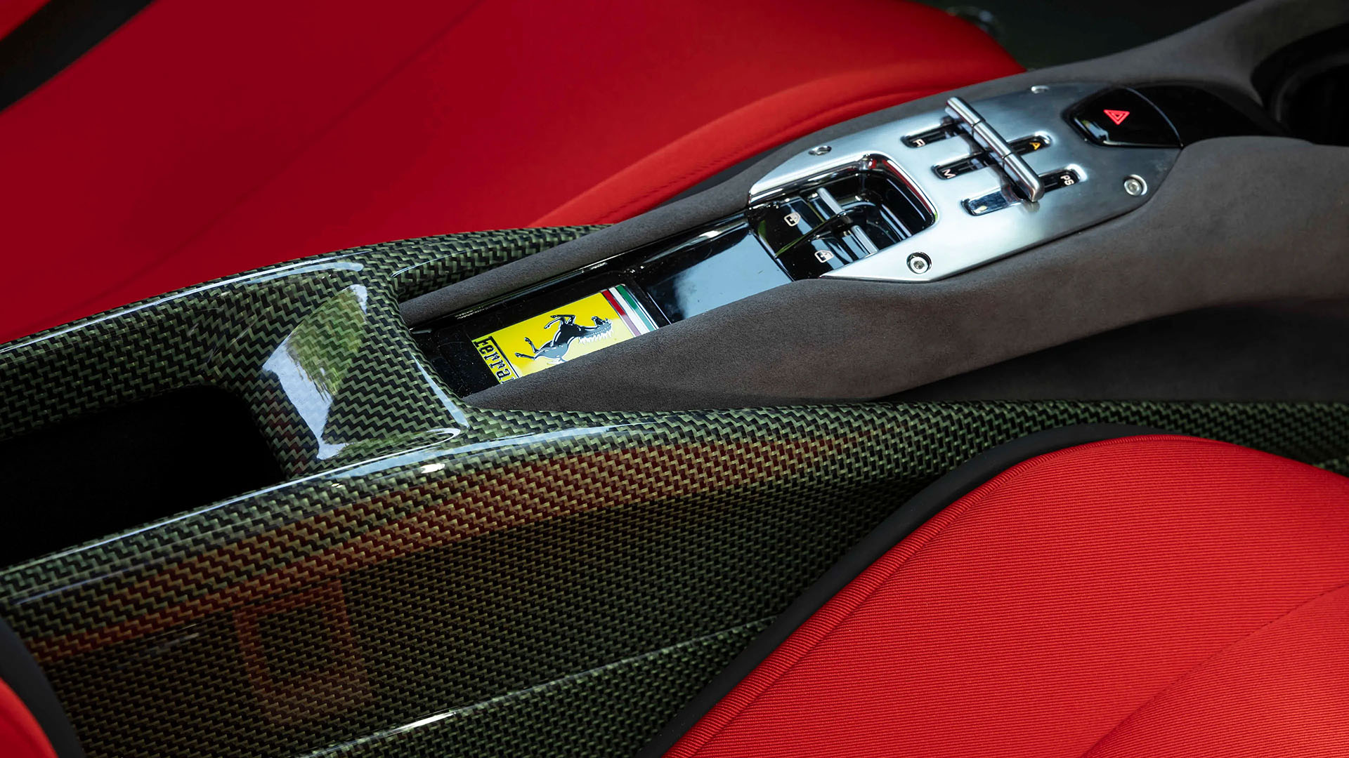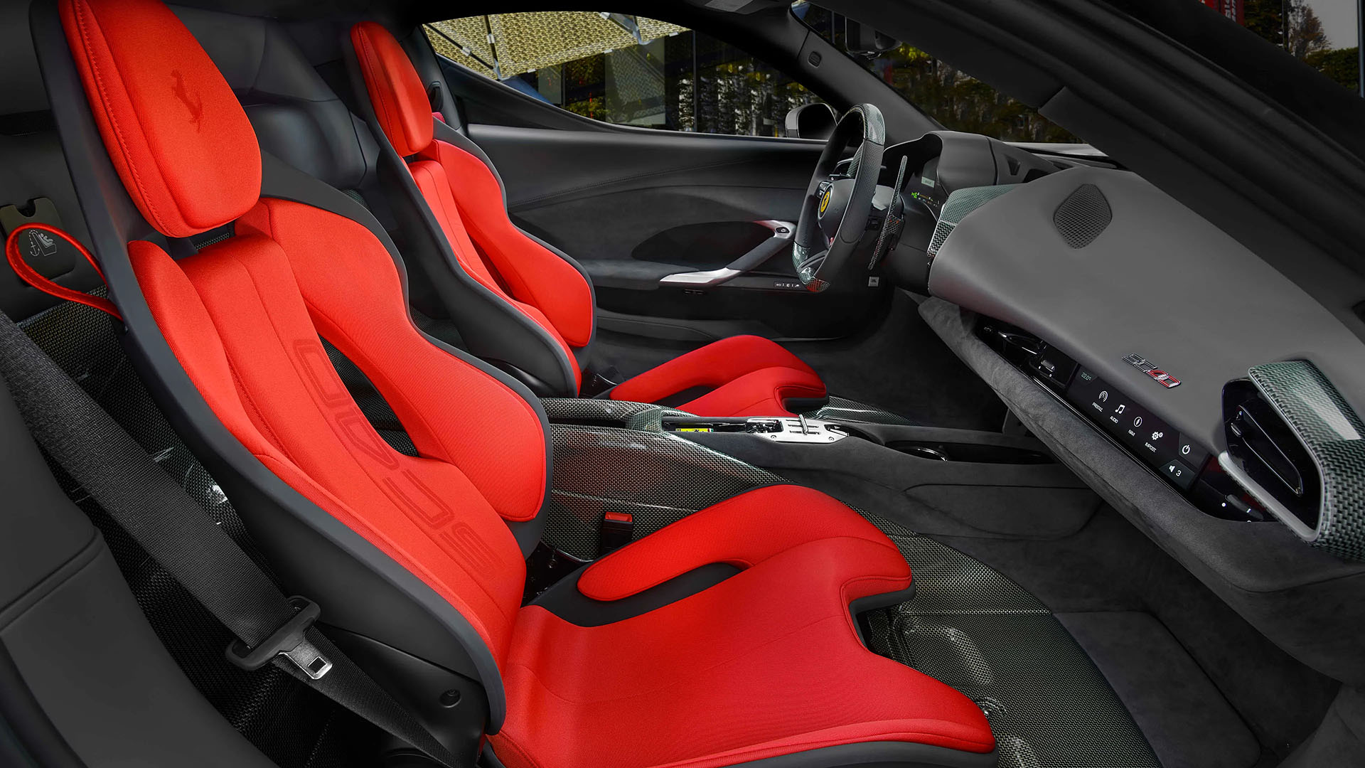 Step inside, and the F40 inspiration is even clearer. The cabin features extensive use of carbon-Kevlar, a modern reinterpretation of the F40โ€™s race-bred minimalism. Itโ€™s found in the footwells, dashboard inserts, and even the steering wheel, contrasted by Charcoal Alcantaraยฎ and red Jacquard fabric upholstery. The seats wear embroidered Prancing Horses and a woven SC40 logo, cementing the carโ€™s bespoke nature.