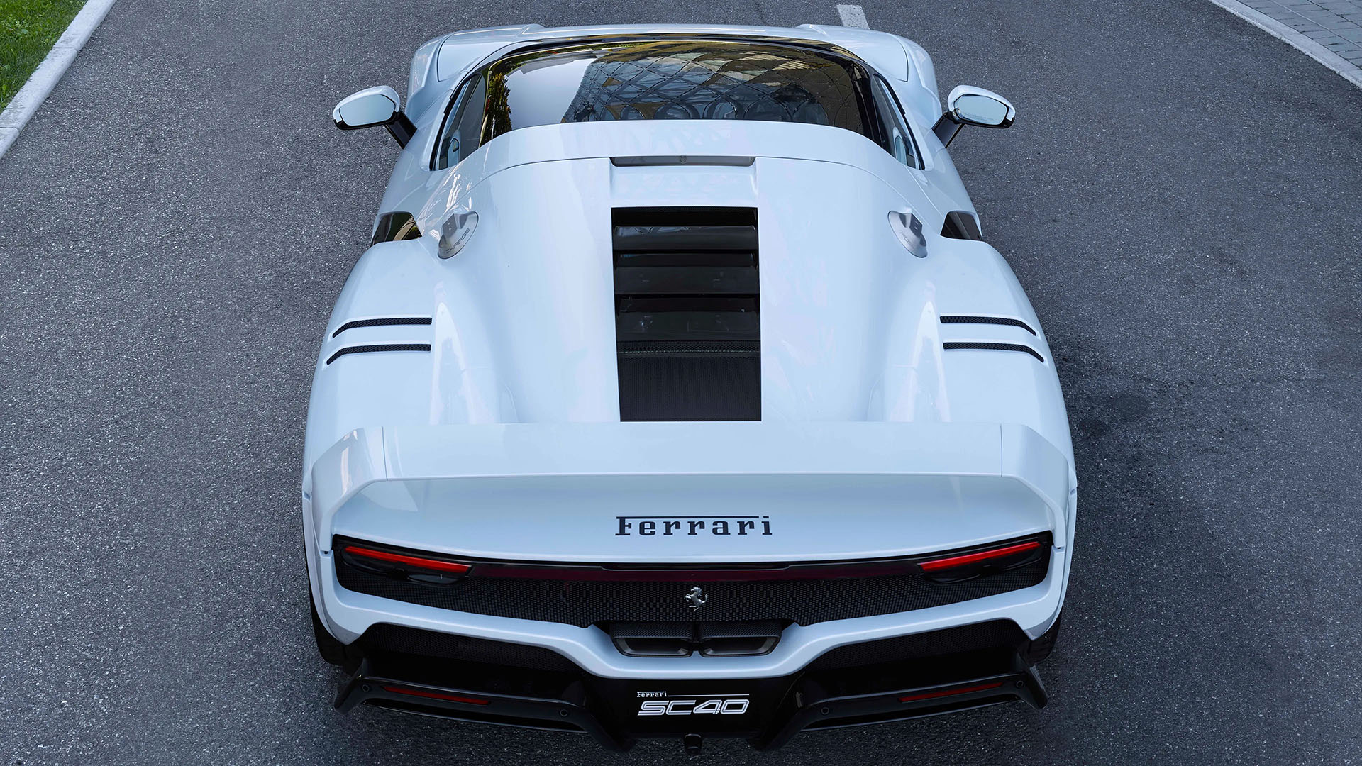 The SC40โ€™s proportions are classic Ferrari: a long, low nose, a short rear overhang, and a high, fixed rear wing that flows seamlessly from the flanks. Painted in a bespoke SC40 White, the wing merges into the engine cover through a black accent line that enhances the visual drama of the rear end. Beneath, an open mesh exposes glimpses of the mechanical heart โ€” a visual reminder that this car, despite its elegance, is every bit a machine.