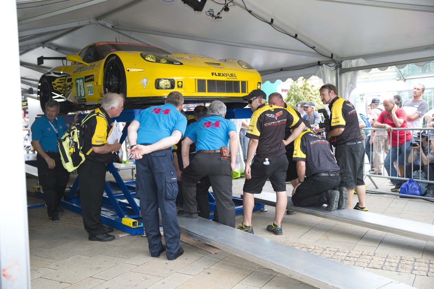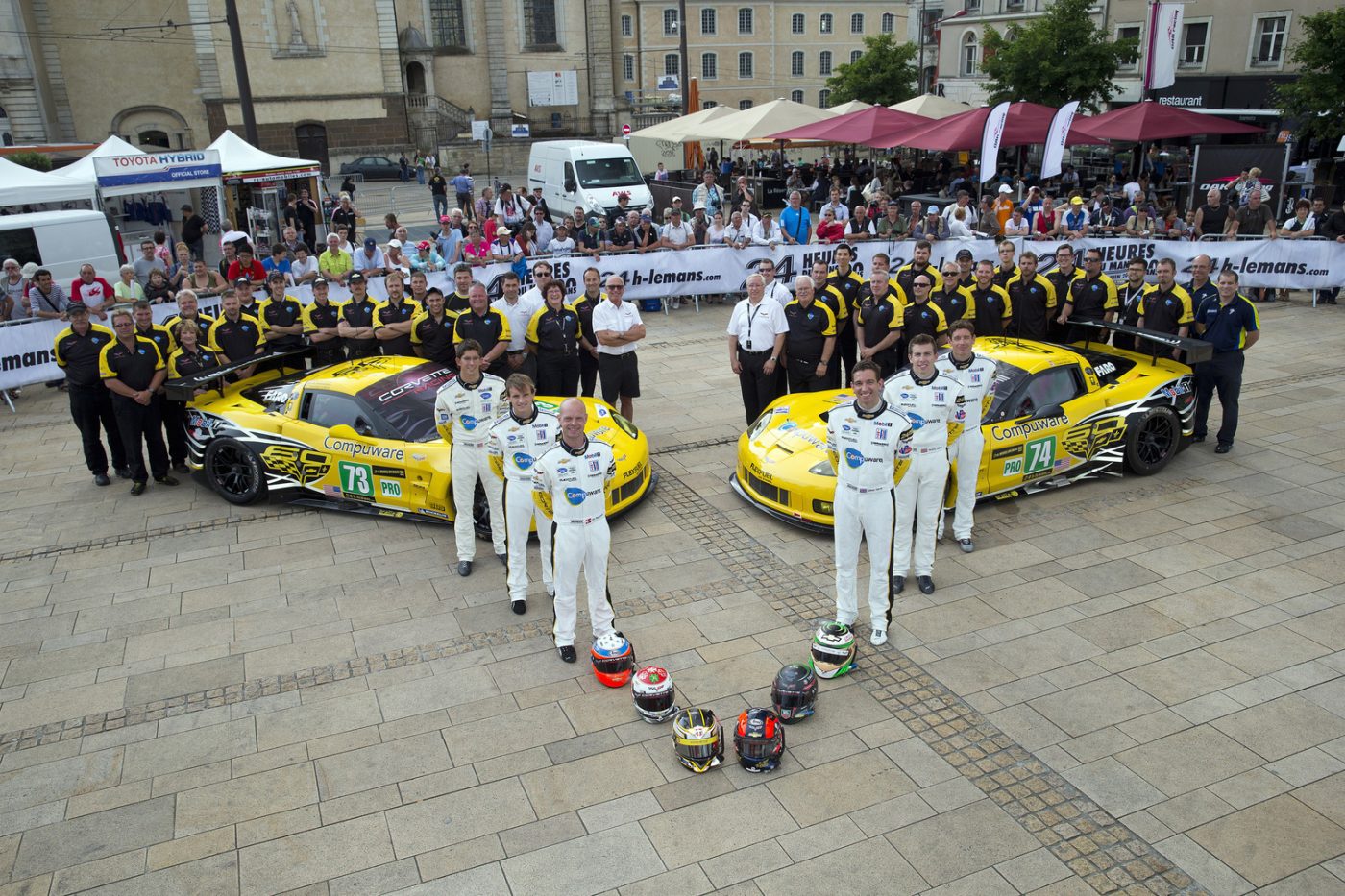 Corvette Racing, 24 Hours of Le Mans, France, June 11, 2012, The Corvette team assembled for a photograph after successfully completing scrutineering (technical inspection) at Place de la Republique in the center of Le Mans (Richard Prince/Corvette Racing Photo).