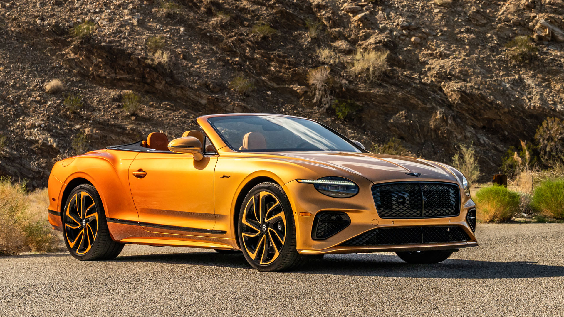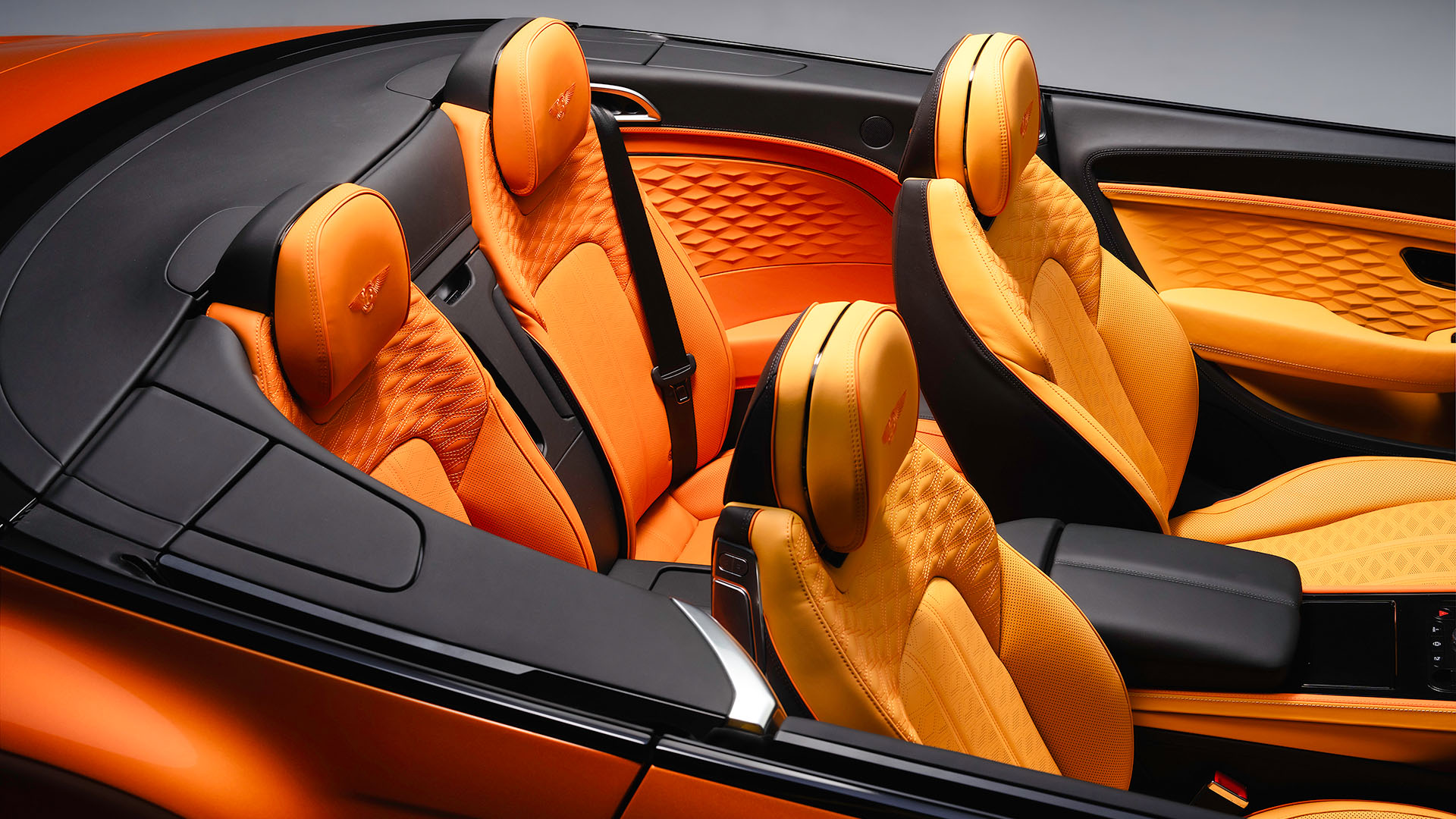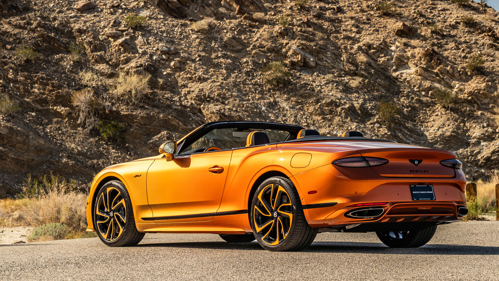 Evoking the sun-soaked hues of Monument Valley and the Painted Desert, the convertible’s interior flows from golden tones up front to deep orange in the rear, accented by Tangerine pinstriping.