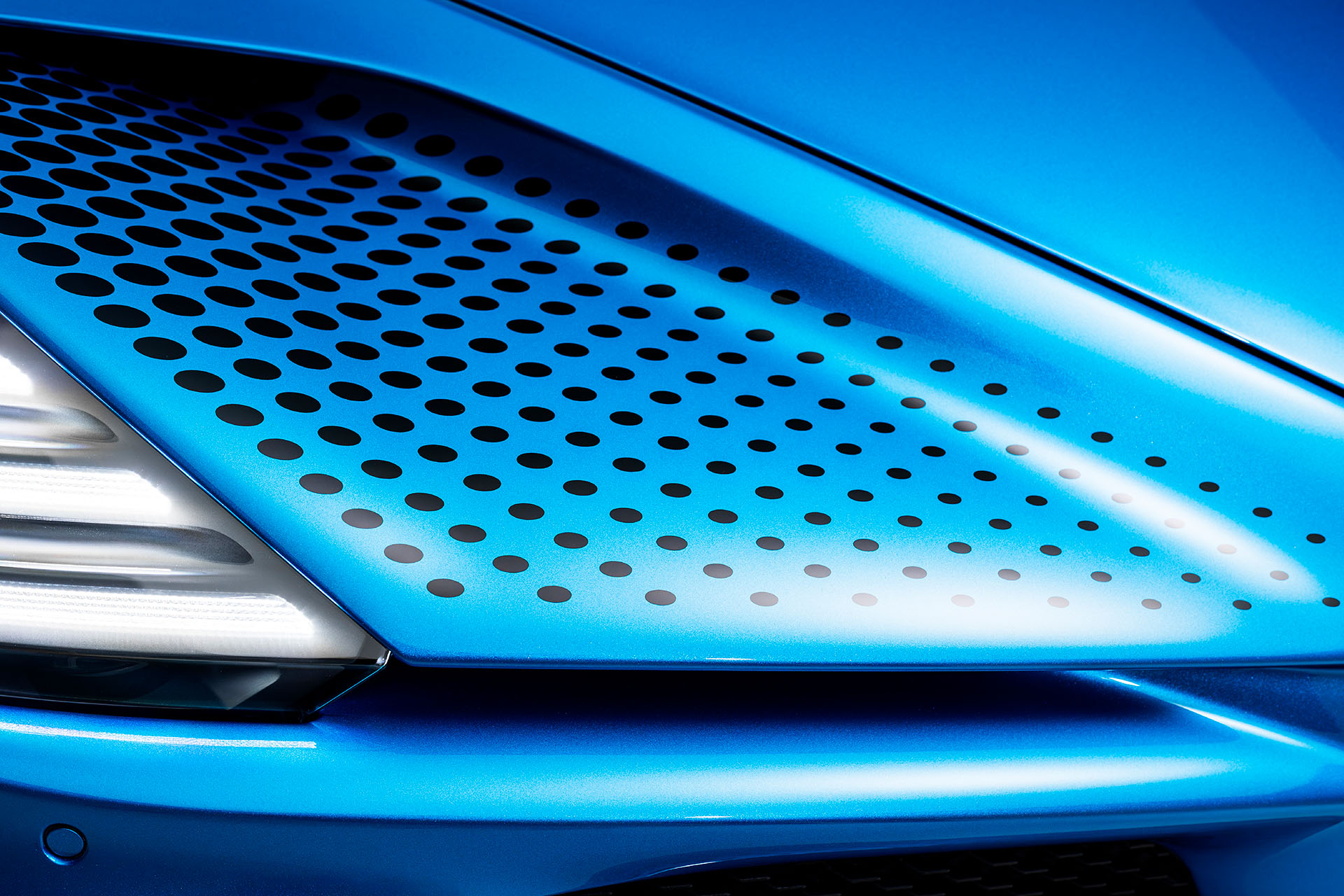 A flowing ellipse pattern sweeps across the bodywork, growing denser toward the rear before dissolving into the air intakes. It’s a design that feels alive, subtle, organic, and constantly changing depending on perspective. Even the wheels are meticulously color-matched, a complex feat given the differing materials and paint processes involved.