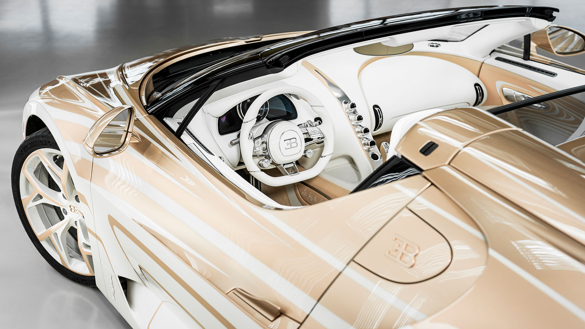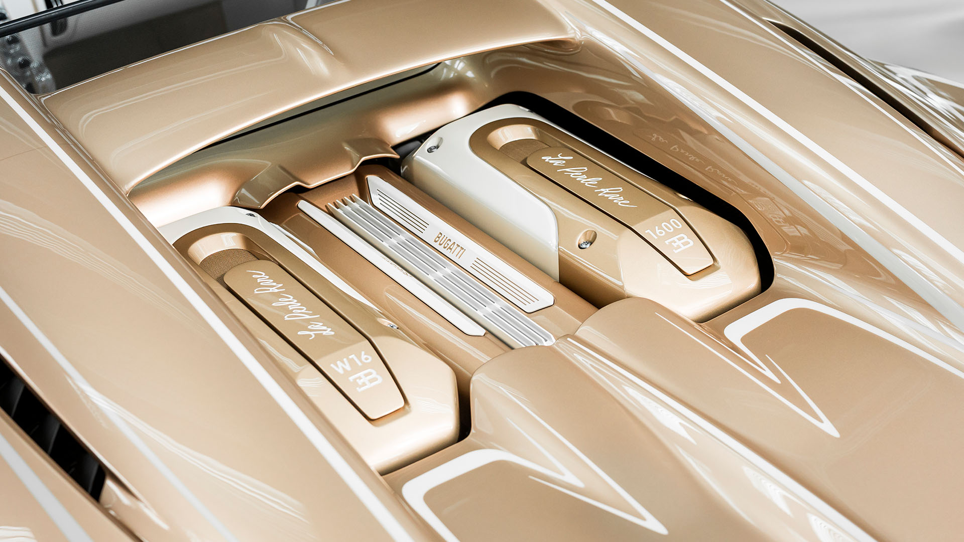 The dividing gold-and-white linework demanded hundreds of hours of painstaking hand-masking and paintwork, underscoring Bugatti’s obsessive attention to detail. Even the diamond-cut alloy wheels receive a specially curated finish that mirrors the body’s pearlescent aesthetic.