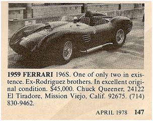 The latest look at old classified advertisements features a Ferrari 196 S race car offered for sale in the April 1978 issue of Road & Track magazine for $45,000.