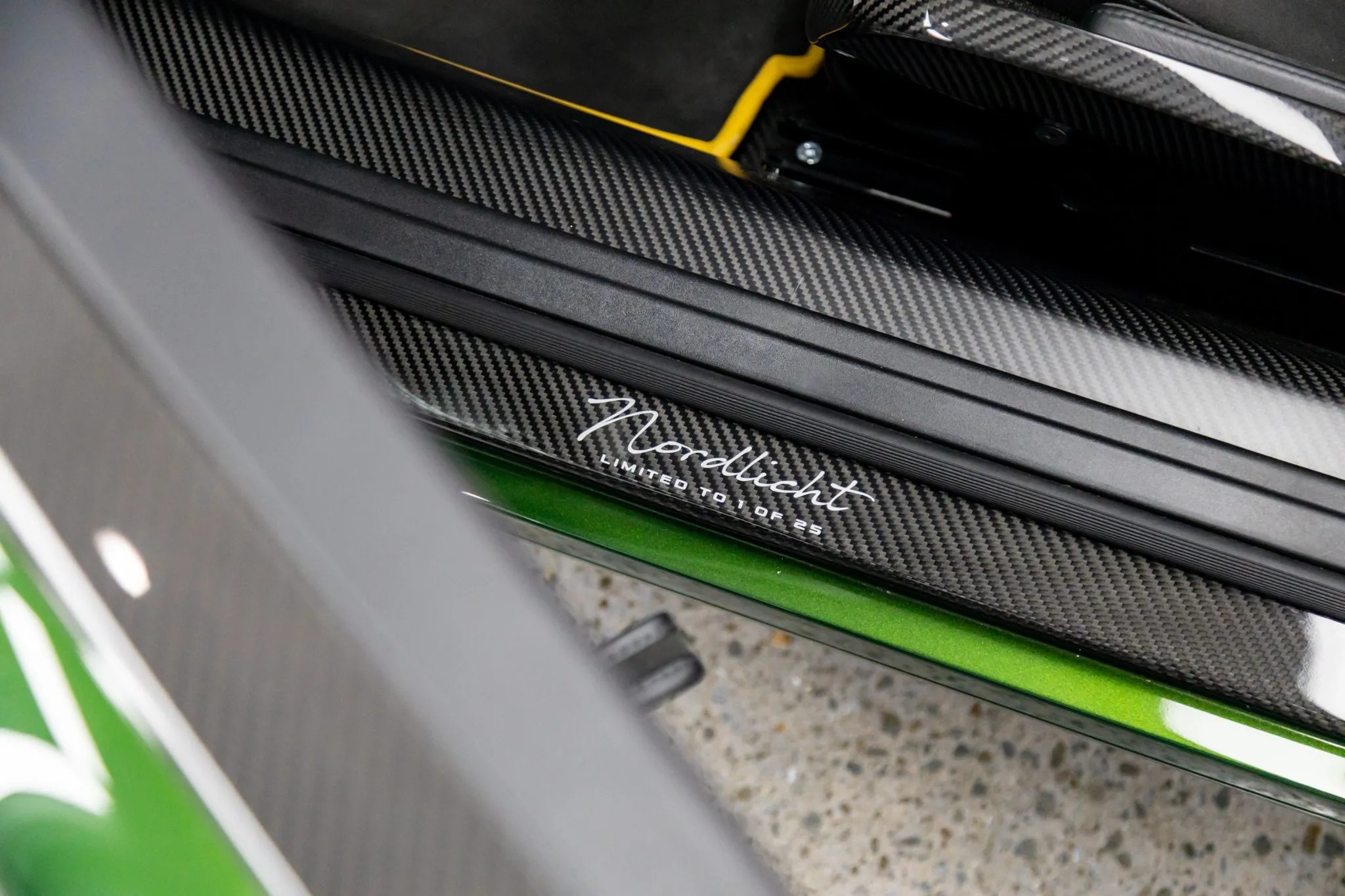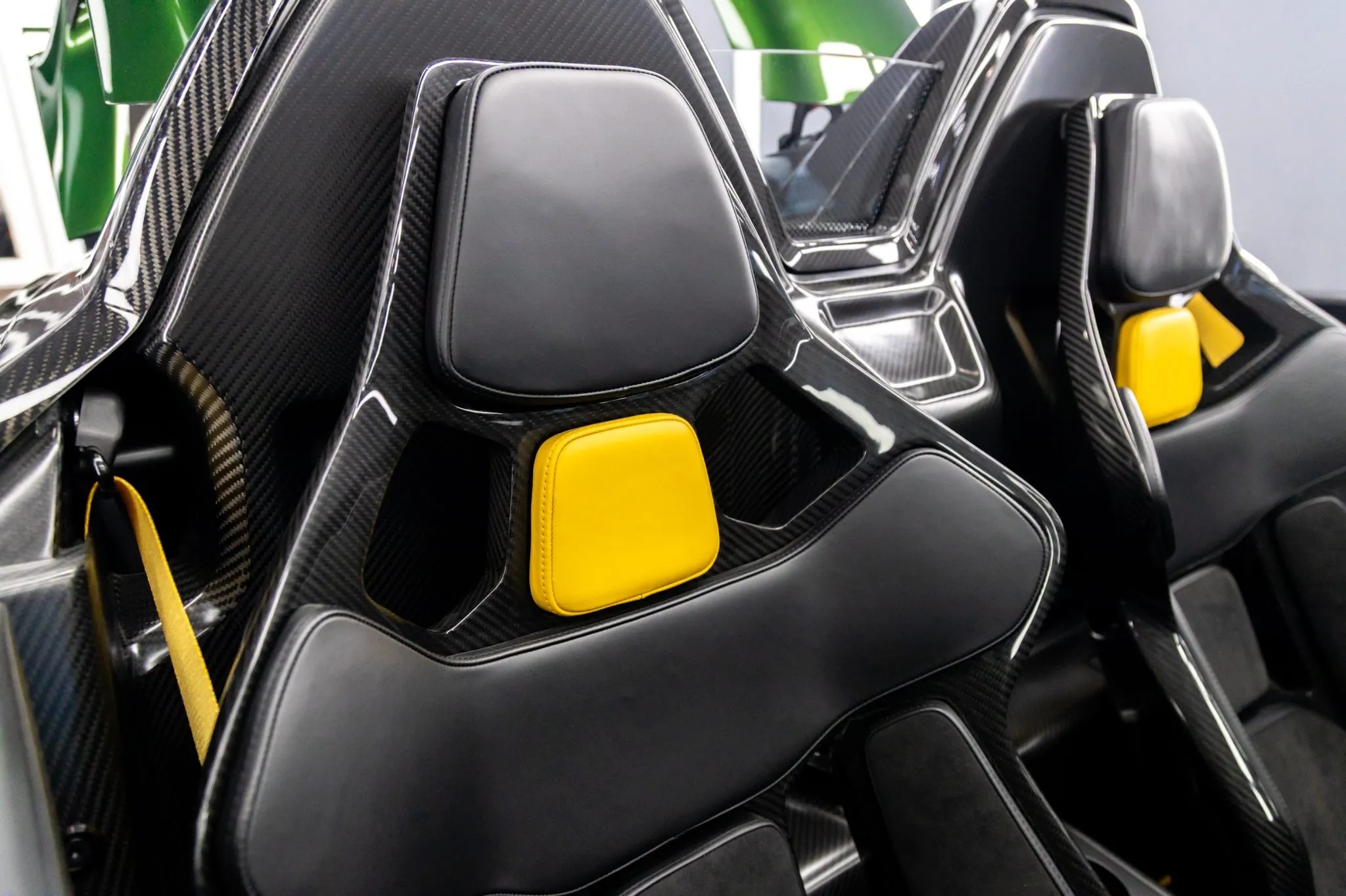 Inside, the cabin combines carbon fiber, black leather, and Alcantara with yellow accents. Highlights include bucket seats, a carbon steering wheel, milled aluminum details, automatic climate control, and a Porsche Classic Radio.