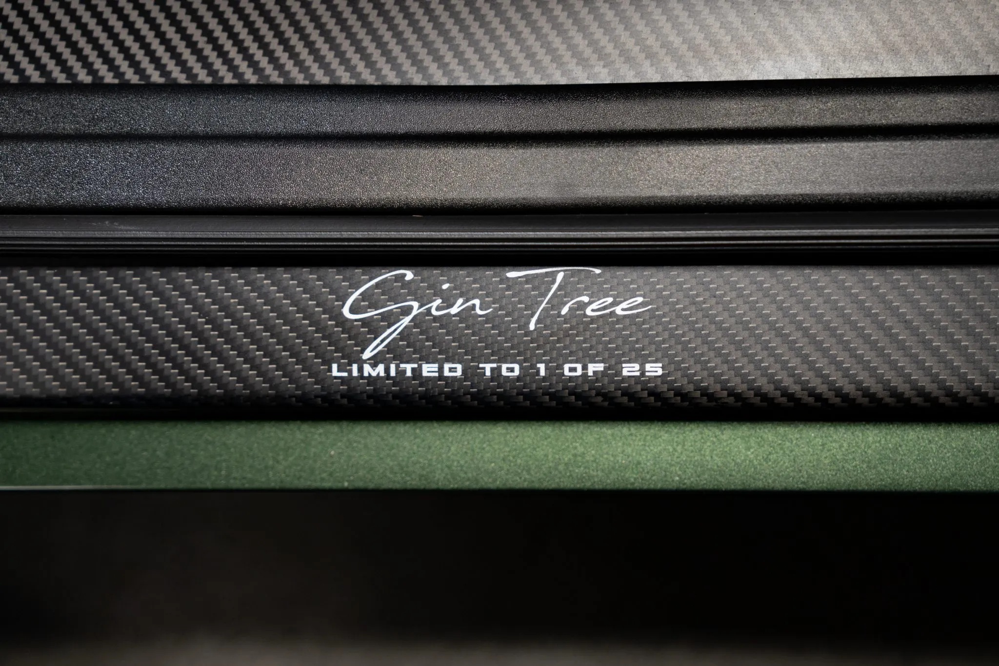 Inside, the tailored two-seat cabin features green leather on the door caps, lower dashboard, and center console, while the carbon-fiber bucket seats are upholstered in multi-tone green leather and Alcantara with yellow leather accents. The rear bulkhead wears exposed carbon fiber with “Launch Edition” branding, echoed by a matching badge on the dashboard, while the rear seats have been removed entirely.