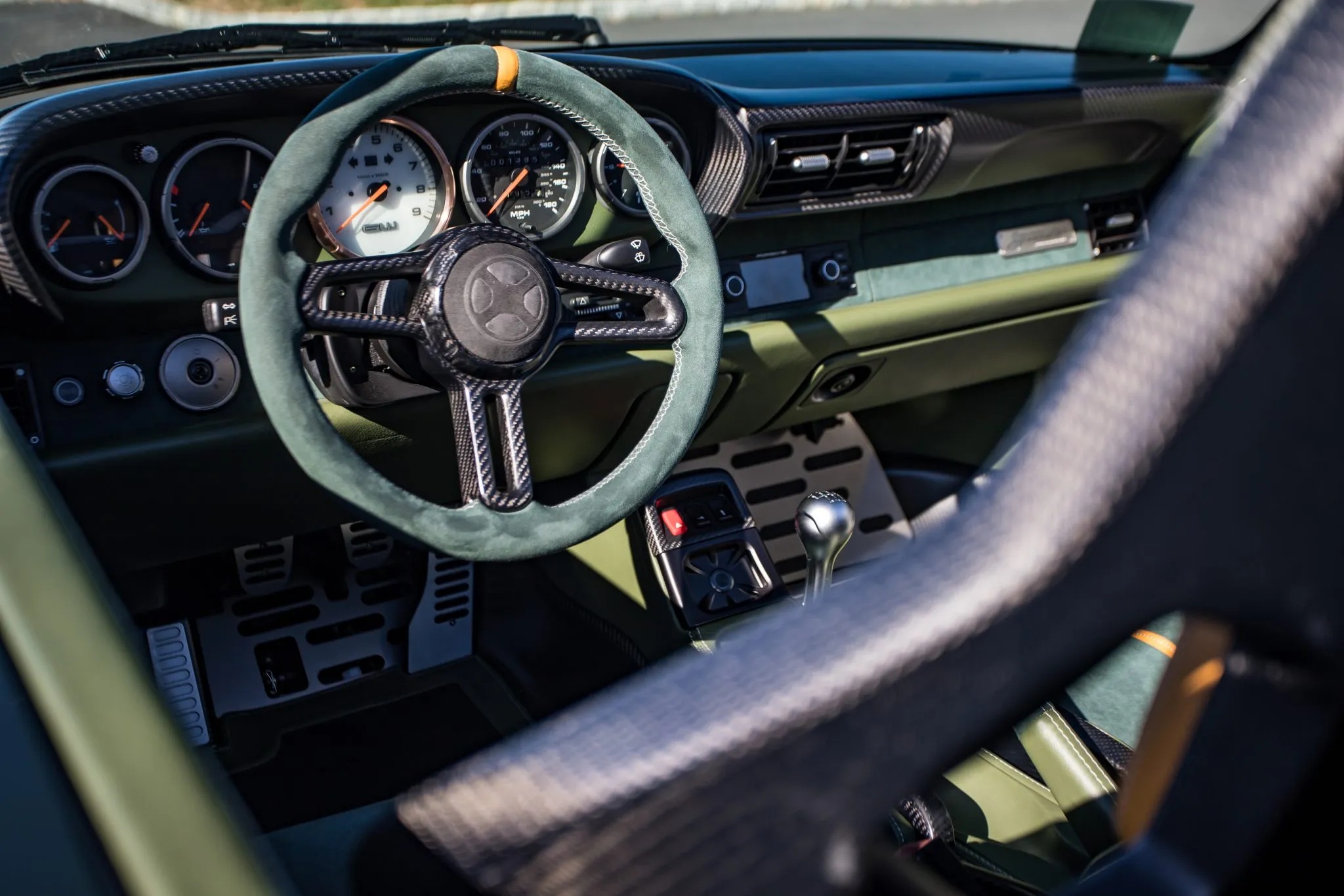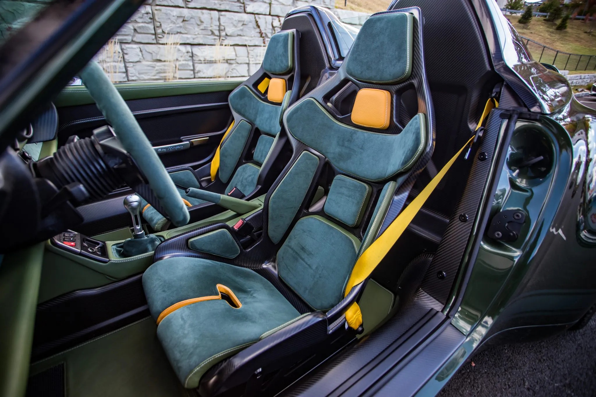 Exposed carbon fiber is visible throughout, joined by a slotted forged aluminum passenger footrest and pedals, green leather floor mats, leather and Alcantara door pulls, yellow seatbelts, automatic climate control, a milled aluminum shifter, and a Porsche Classic Radio.