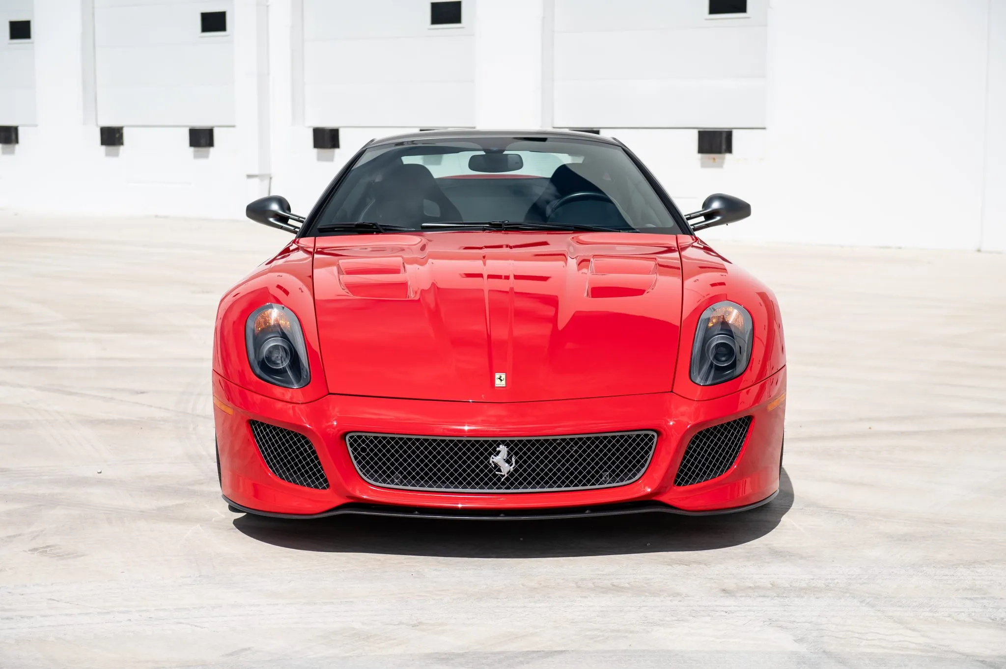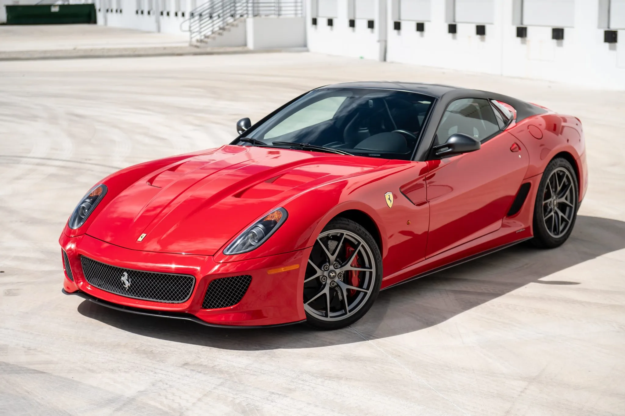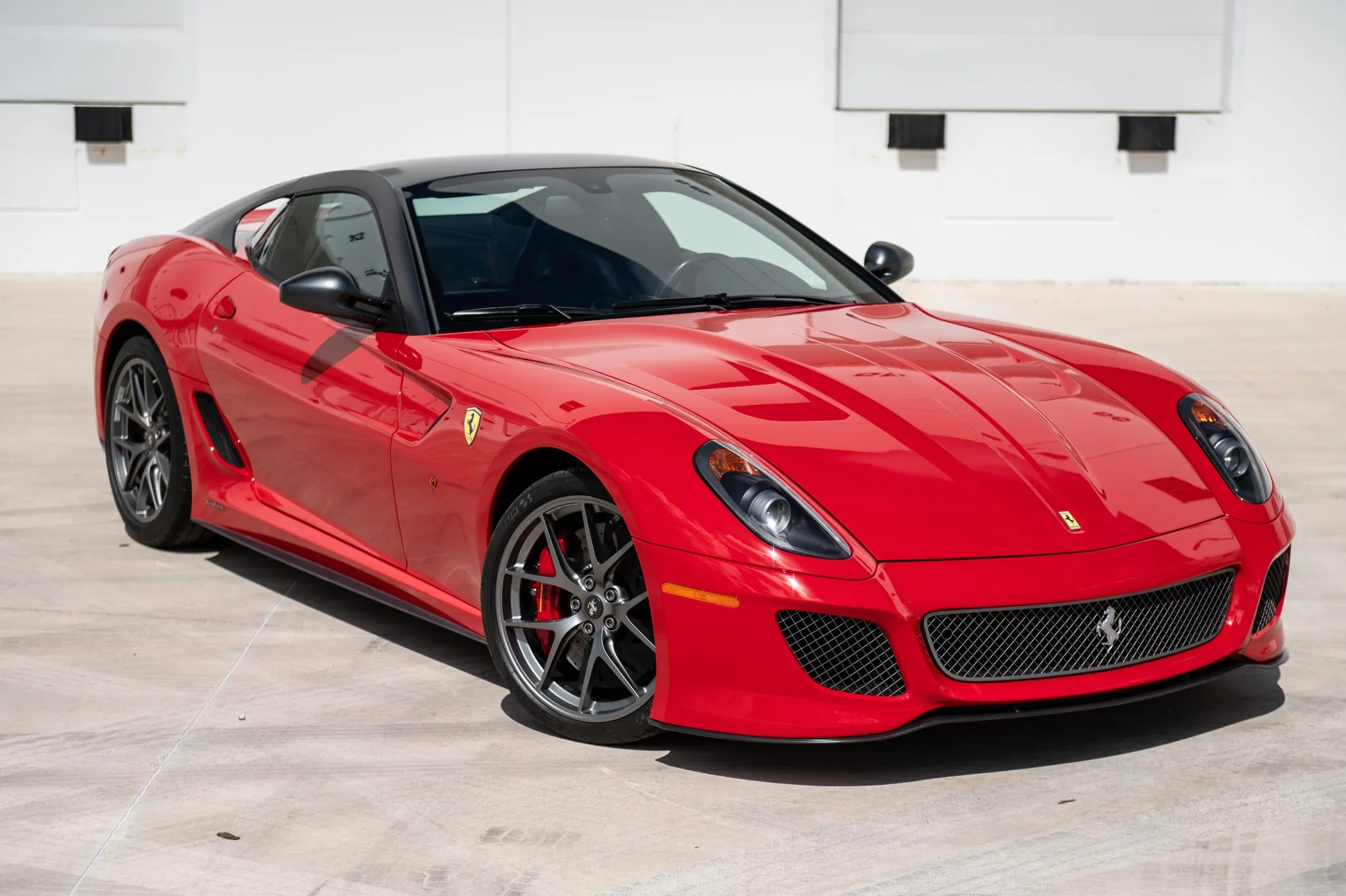 Offered for sale on Bring a Trailer, this example is finished in Rosso Corsa with a Grigio Silverstone Opaco roof, mirrors, and flying-buttress C-pillars. Carbon-fiber components include the front spoiler and rear diffuser, complemented by bi-xenon headlights, Scuderia Ferrari fender shields, and quad exhaust outlets.