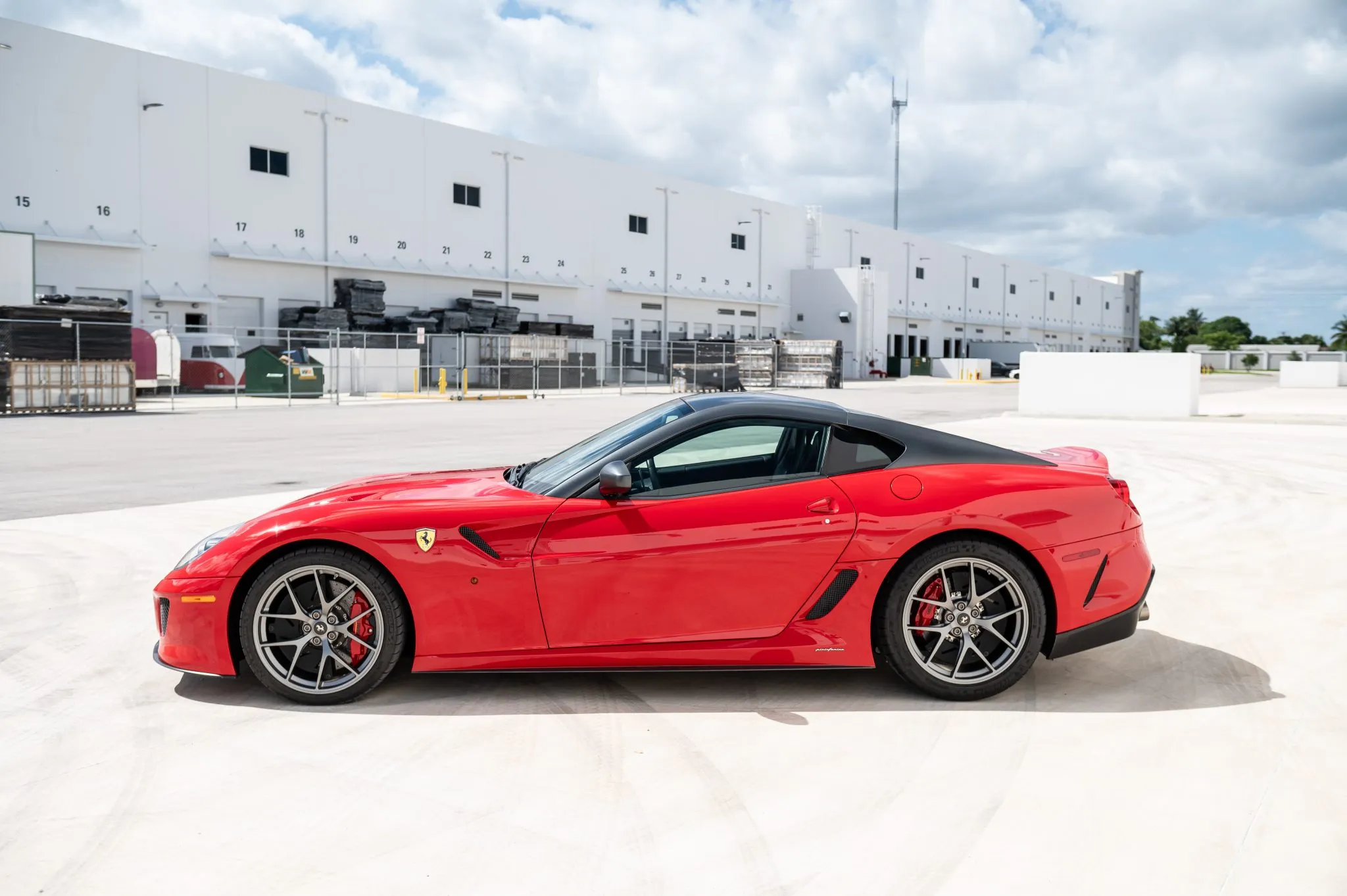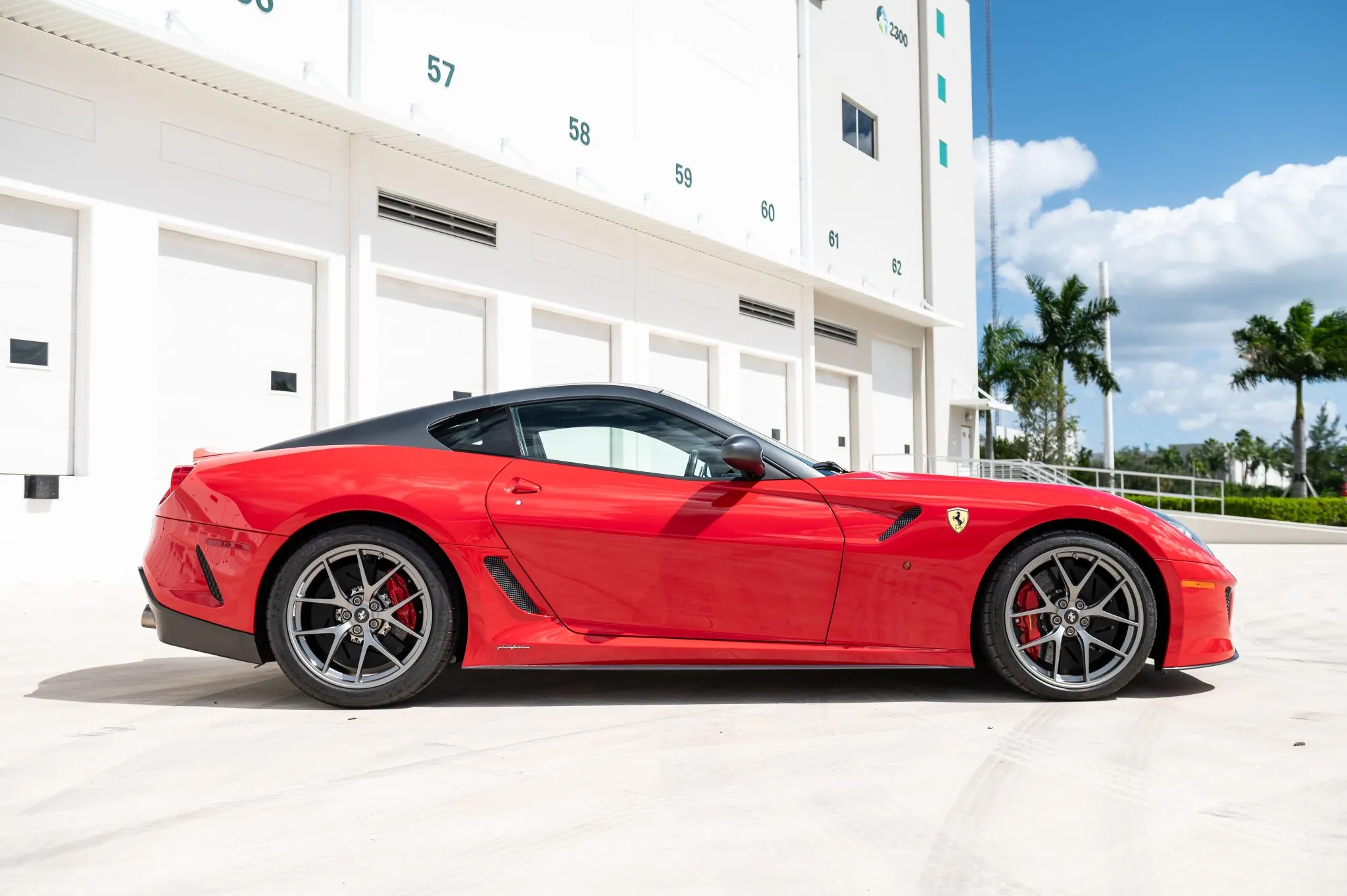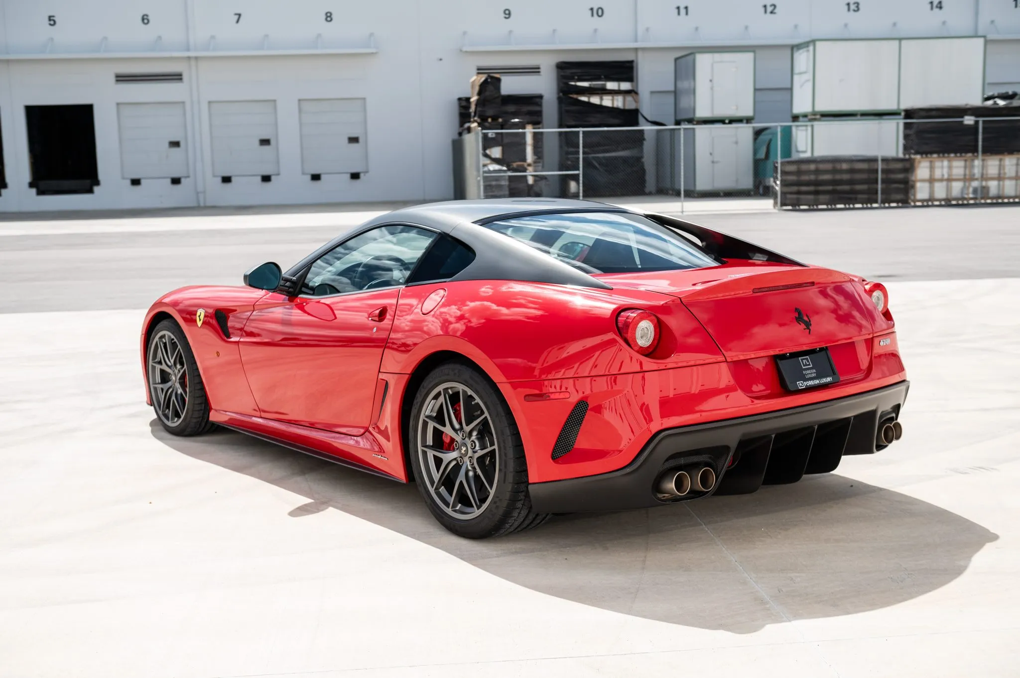 Offered for sale on Bring a Trailer, this example is finished in Rosso Corsa with a Grigio Silverstone Opaco roof, mirrors, and flying-buttress C-pillars. Carbon-fiber components include the front spoiler and rear diffuser, complemented by bi-xenon headlights, Scuderia Ferrari fender shields, and quad exhaust outlets.