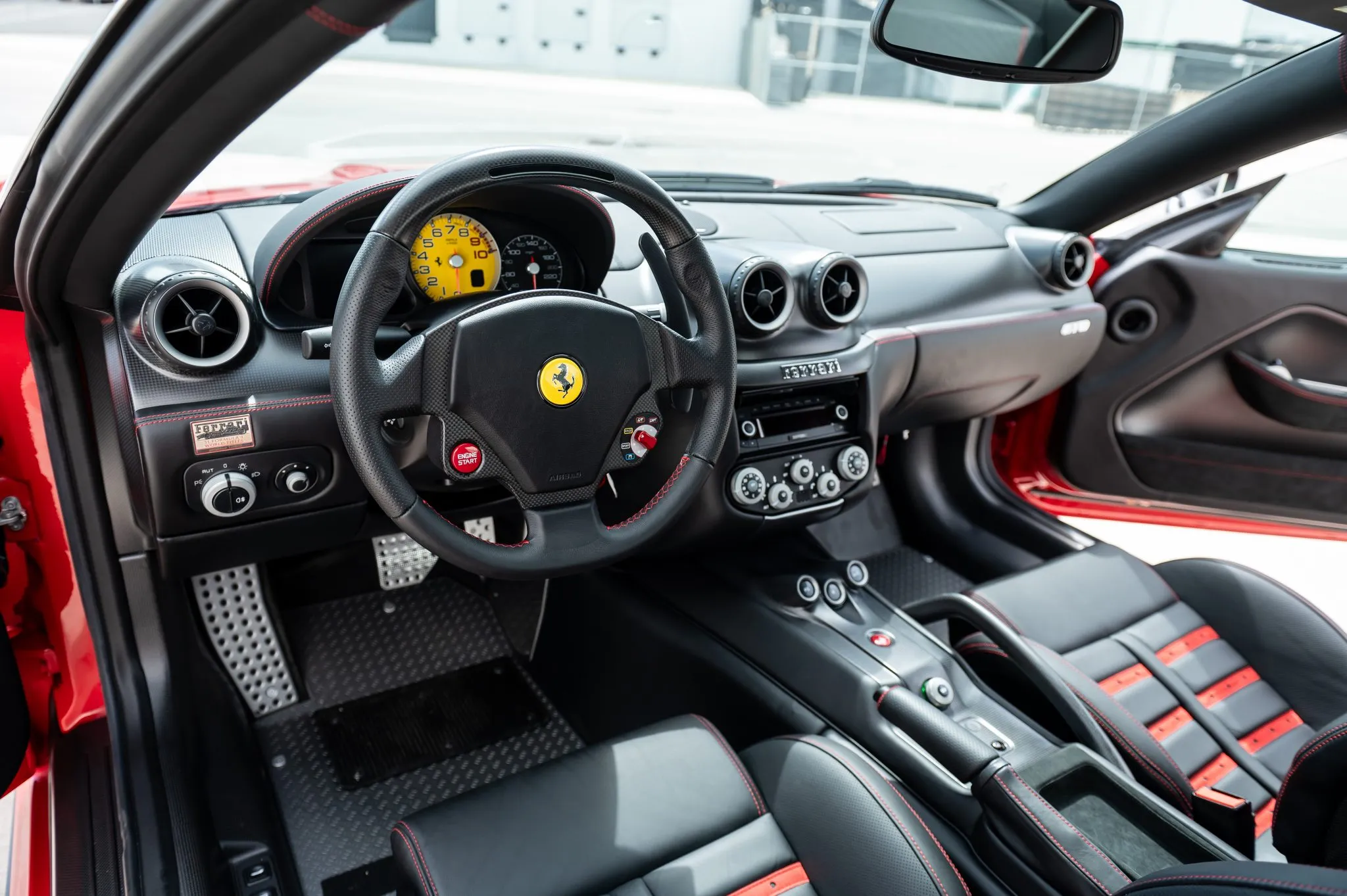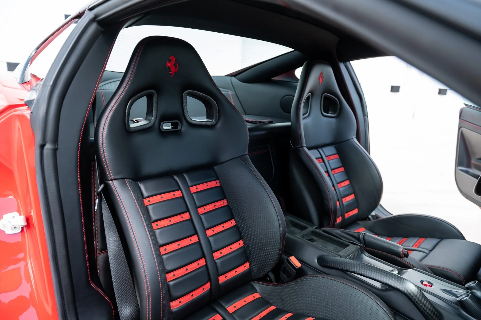 Inside, carbon-fiber Daytona-style sport seats are upholstered in black leather with red stitching and prancing horse embroidery. Matching leather and carbon-fiber trim extend across the dash, console, doors, and sills. Features include a carbon-fiber steering wheel with engine start and manettino controls, Bose audio, dual-zone climate control, power steering adjustment, drilled-metal pedals, and checkerplate aluminum footwells.