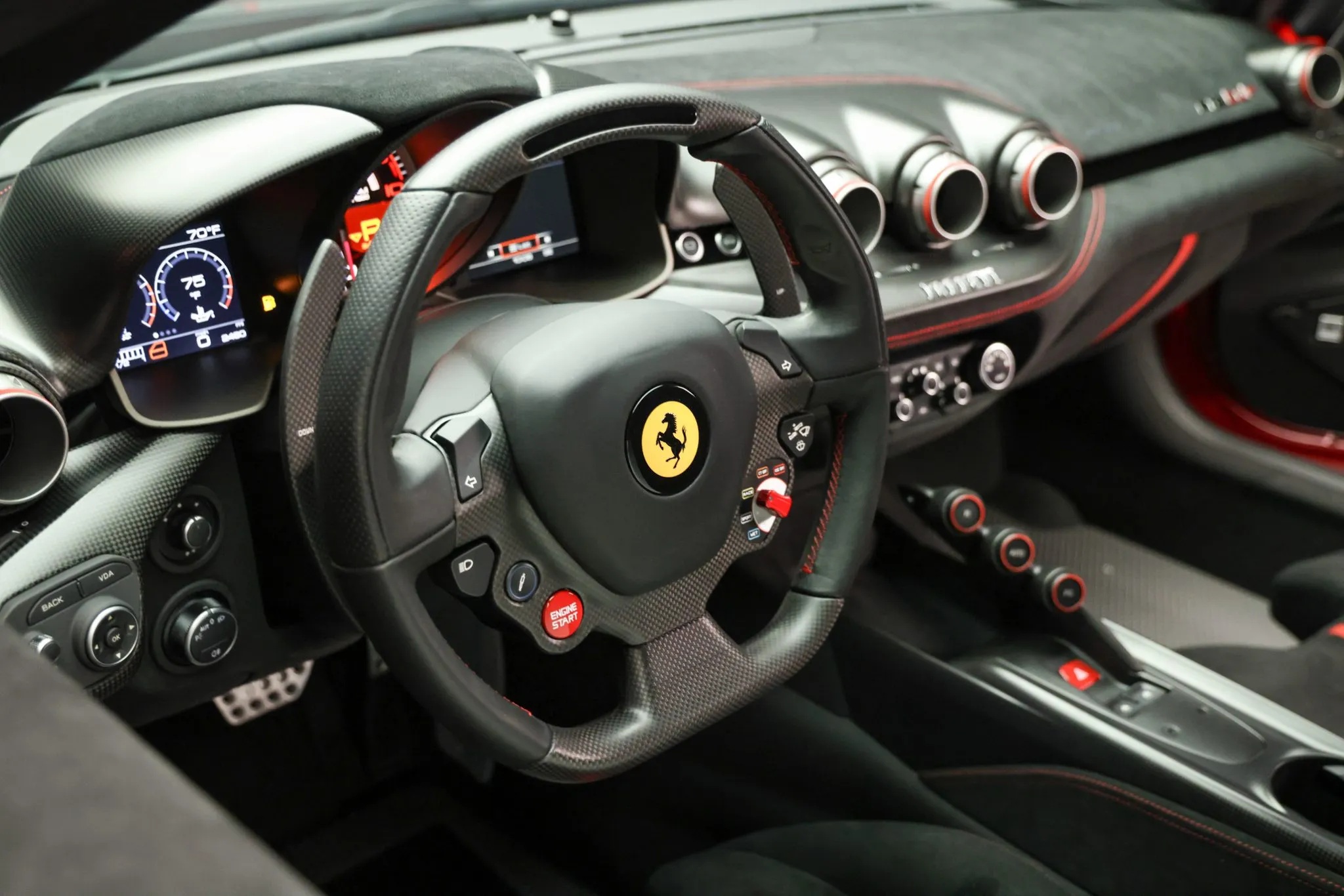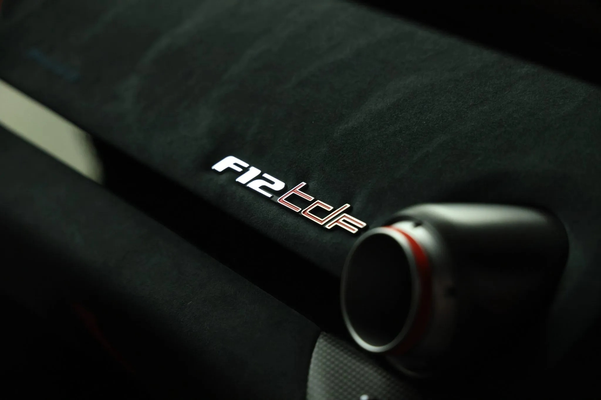 Power came from an enhanced 6.3-liter V12 delivering 769 horsepower at 8,500 rpm and 520 lb-ft of torque at 6,750 rpmโgains of 39 horsepower and 11 lb-ft over the standard F12. With extensive use of carbon fiber for the hood, decklid, and doors, along with thinner glass and a wider track, the F12tdf was about 243 pounds lighter than the F12berlinetta. The result was an explosive performance: 0โ62 mph in 2.9 seconds, a top speed exceeding 211 mph, and a Fiorano lap time two seconds quicker than the standard model.