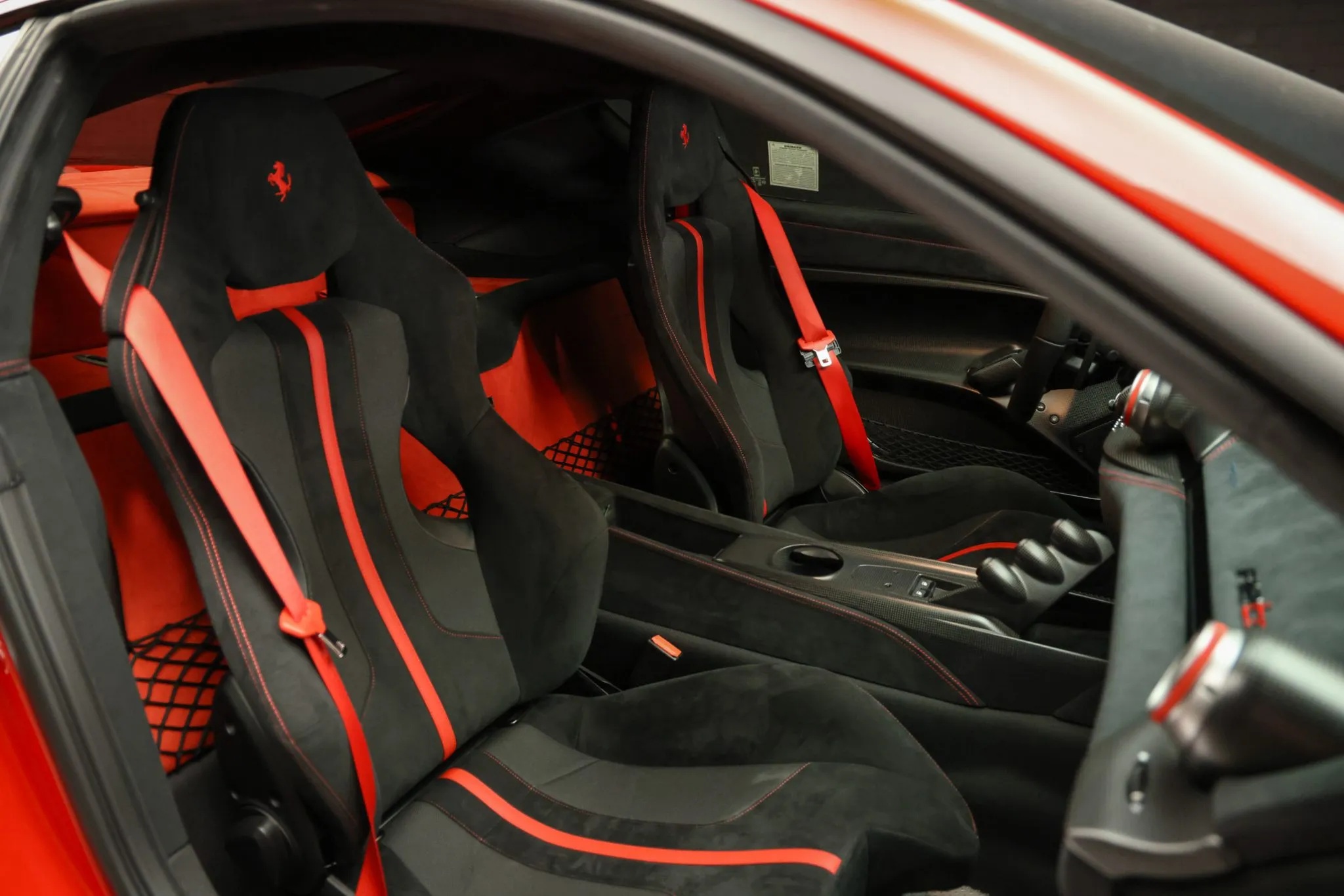 The example currently listed on Bring a Trailer was originally delivered through Towbin Toy Store of Las Vegas, Nevada, to its first owner, who selected a striking specification. The car is finished in Rosso Corsa with a Nero Stellato racing stripe and Scuderia Ferrari fender shields. The cabin is upholstered in Nero Alcantara, featuring Rosso stitching, accents, and embroidered Cavallino logos on the headrests.
