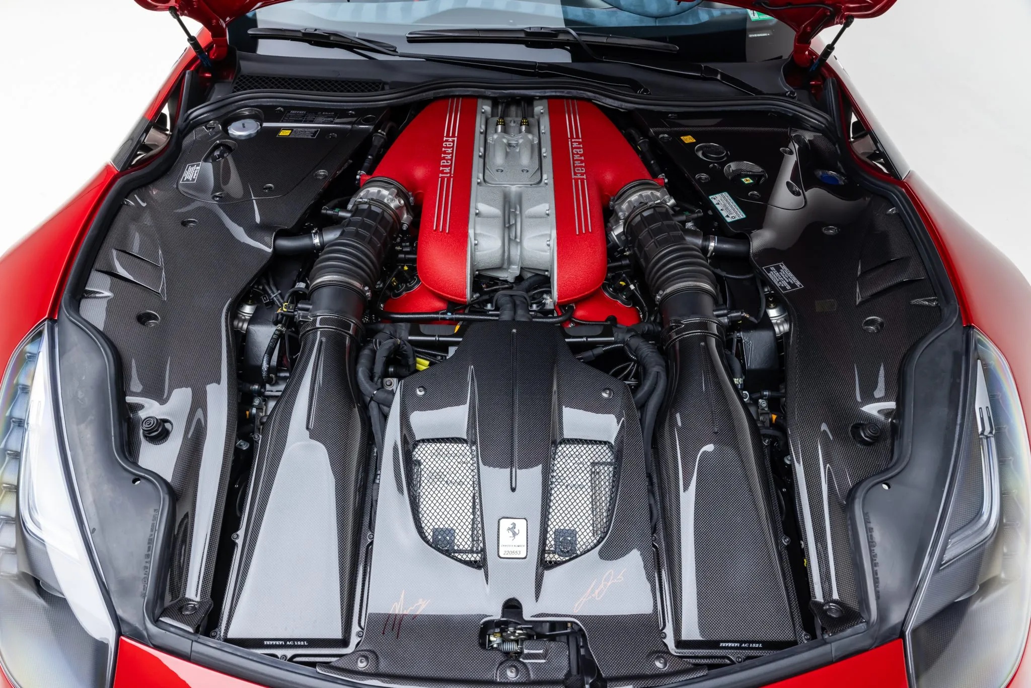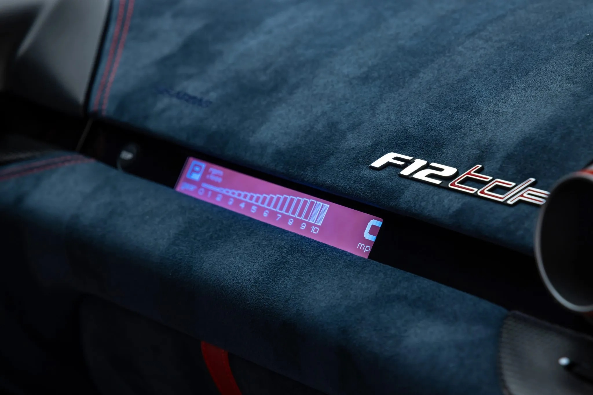 This example is finished in Rosso Berlinetta with Scuderia Ferrari fender shields and an Italian tricolor on the rear decklid. The interior features large carbon-backed racing seats trimmed in Blu Medio Alcantara with Rosso Ferrari inserts, stitching, and embroidered Cavallino logos.