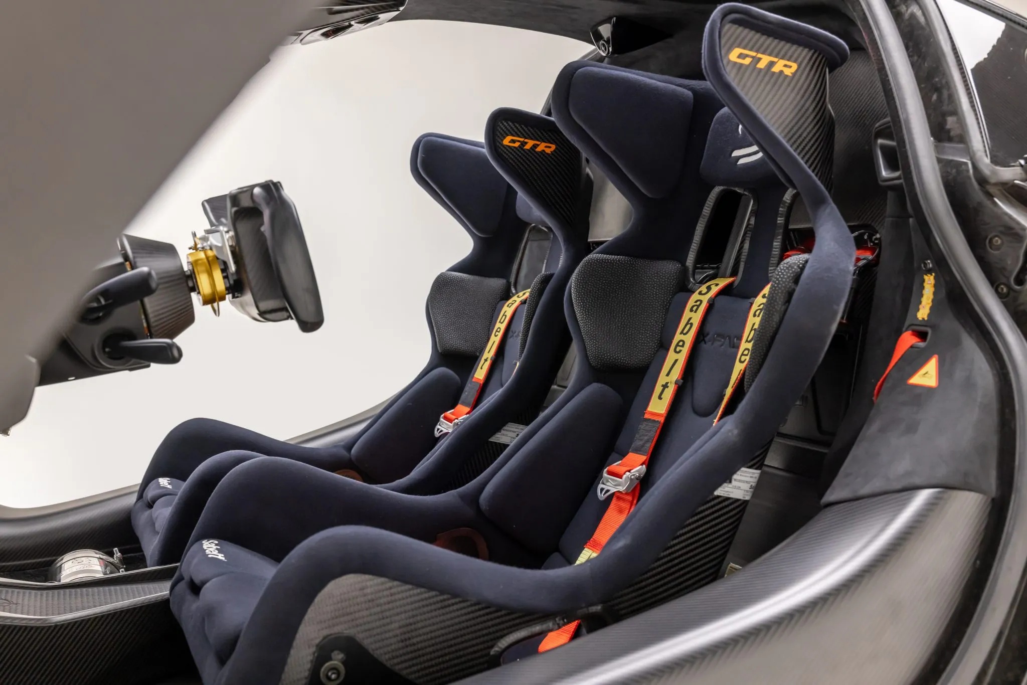 Inside, GTR-branded Sabelt carbon-fiber fixed-back seats are trimmed in black Alcantara and fitted with six-point harnesses. Additional equipment includes titanium-nitride pedals with LM logos, leather door pulls, an integrated roll cage, fire suppression, data logging, pit-to-car radio, and air conditioning.