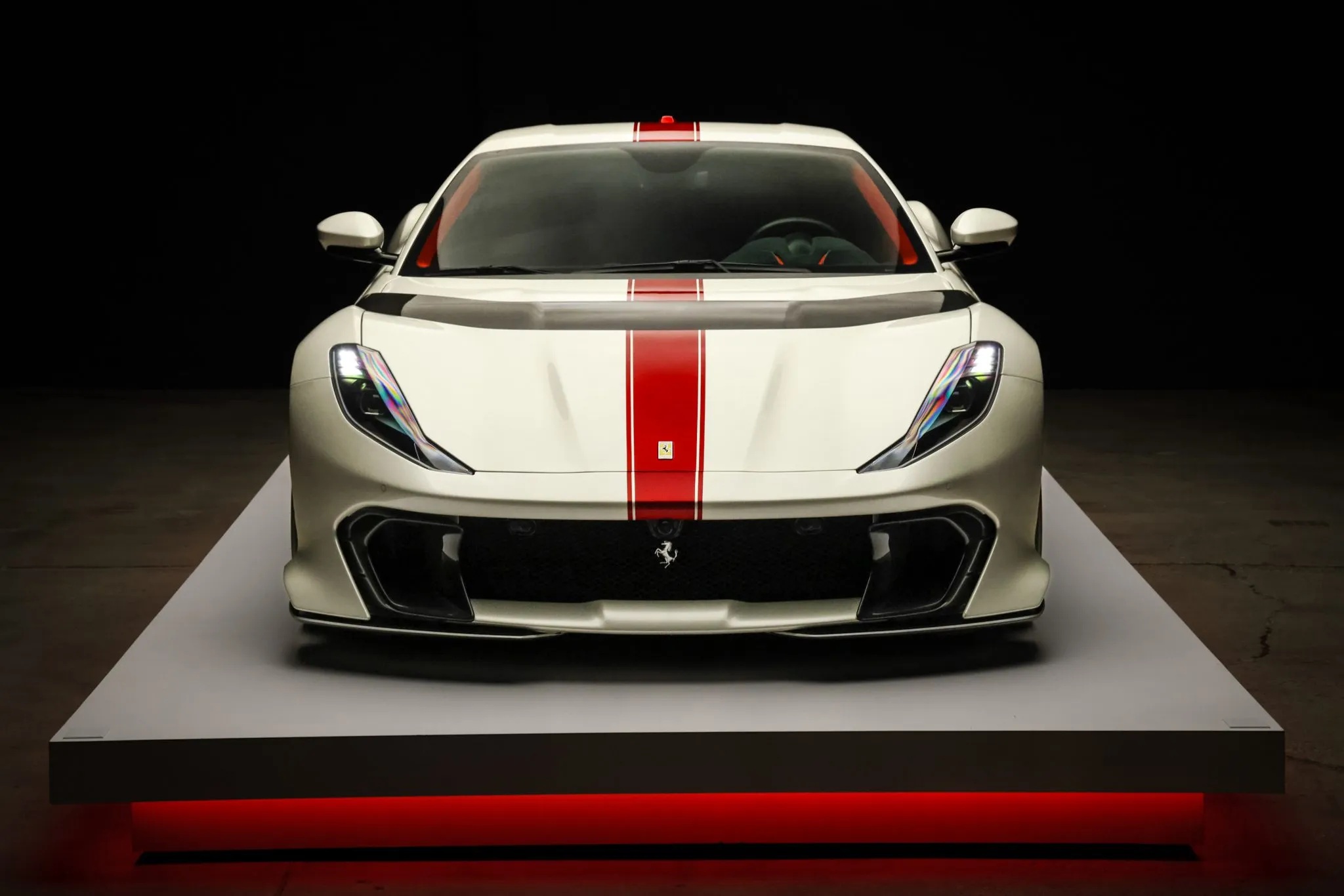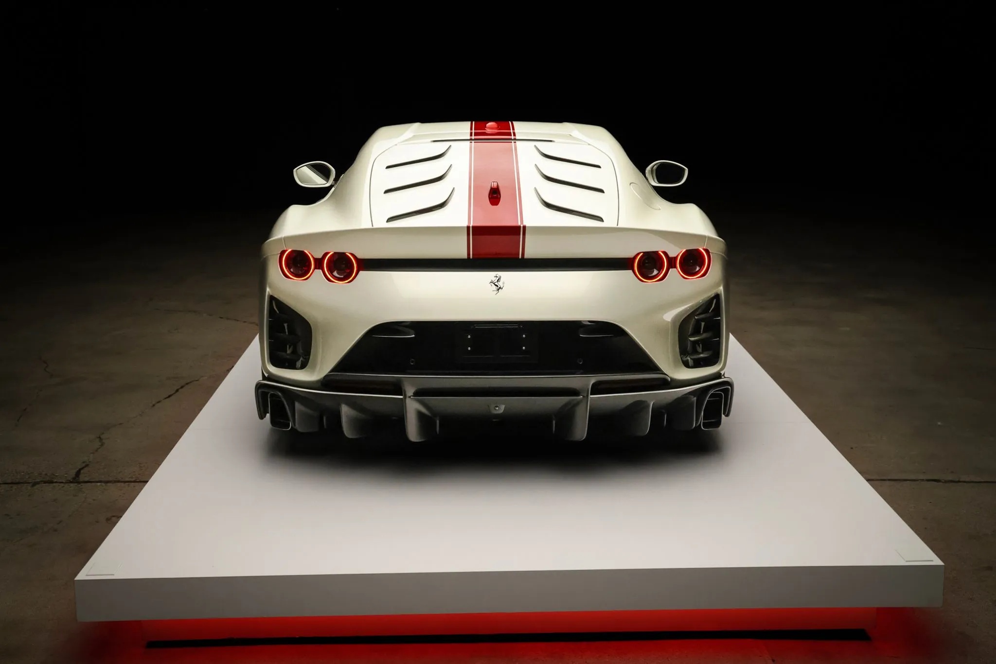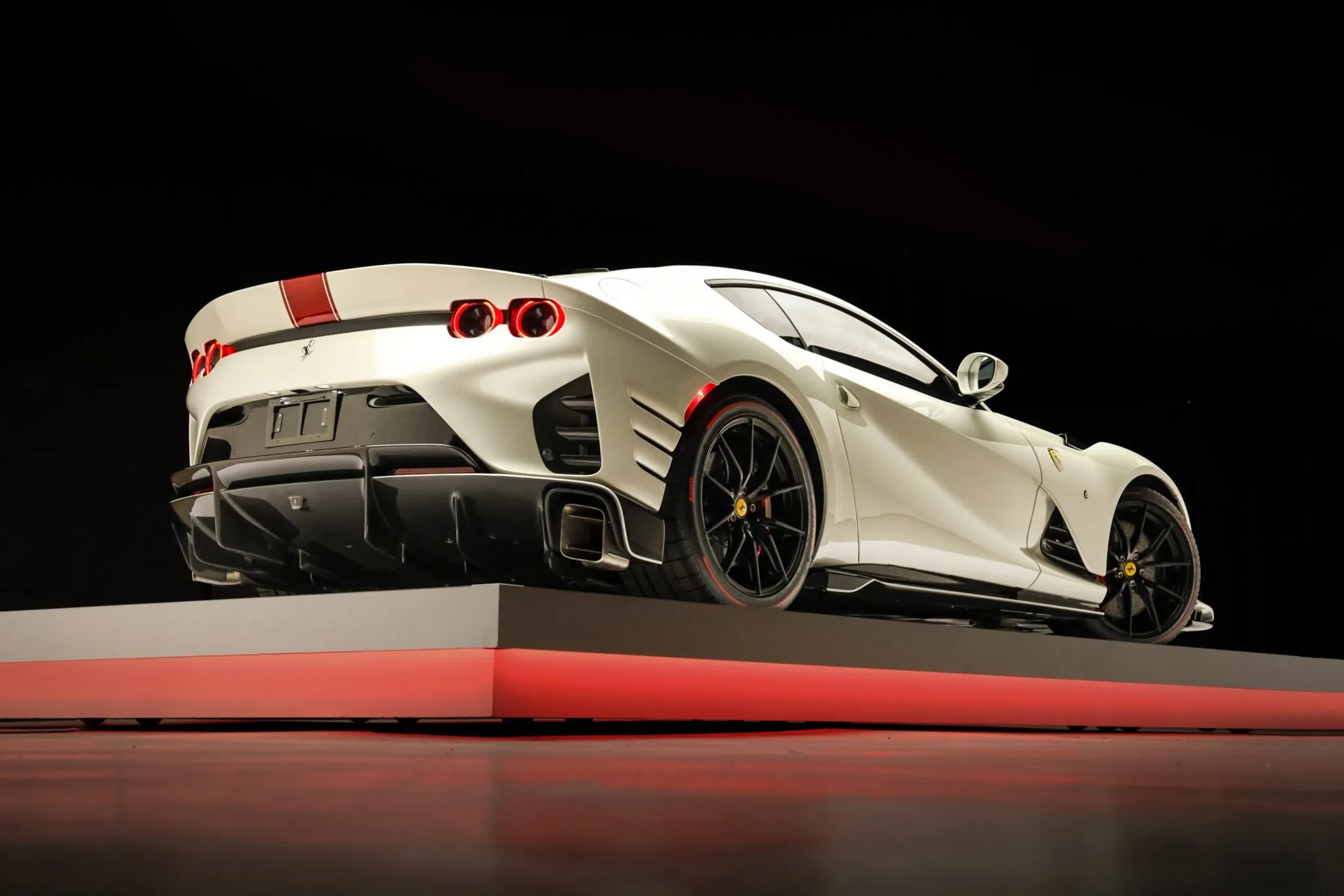 Finished in Bianco Italia accented by a bold Rosso Fuoco central stripe and Scuderia Ferrari shields, the carโs dramatic exterior also serves an aerodynamic purpose. A carbon-fiber blade-style hood, revised intake ducts, an innovative rear screen with six vortex generators, and a meticulously sculpted underbody work together to increase downforce and reduce drag.