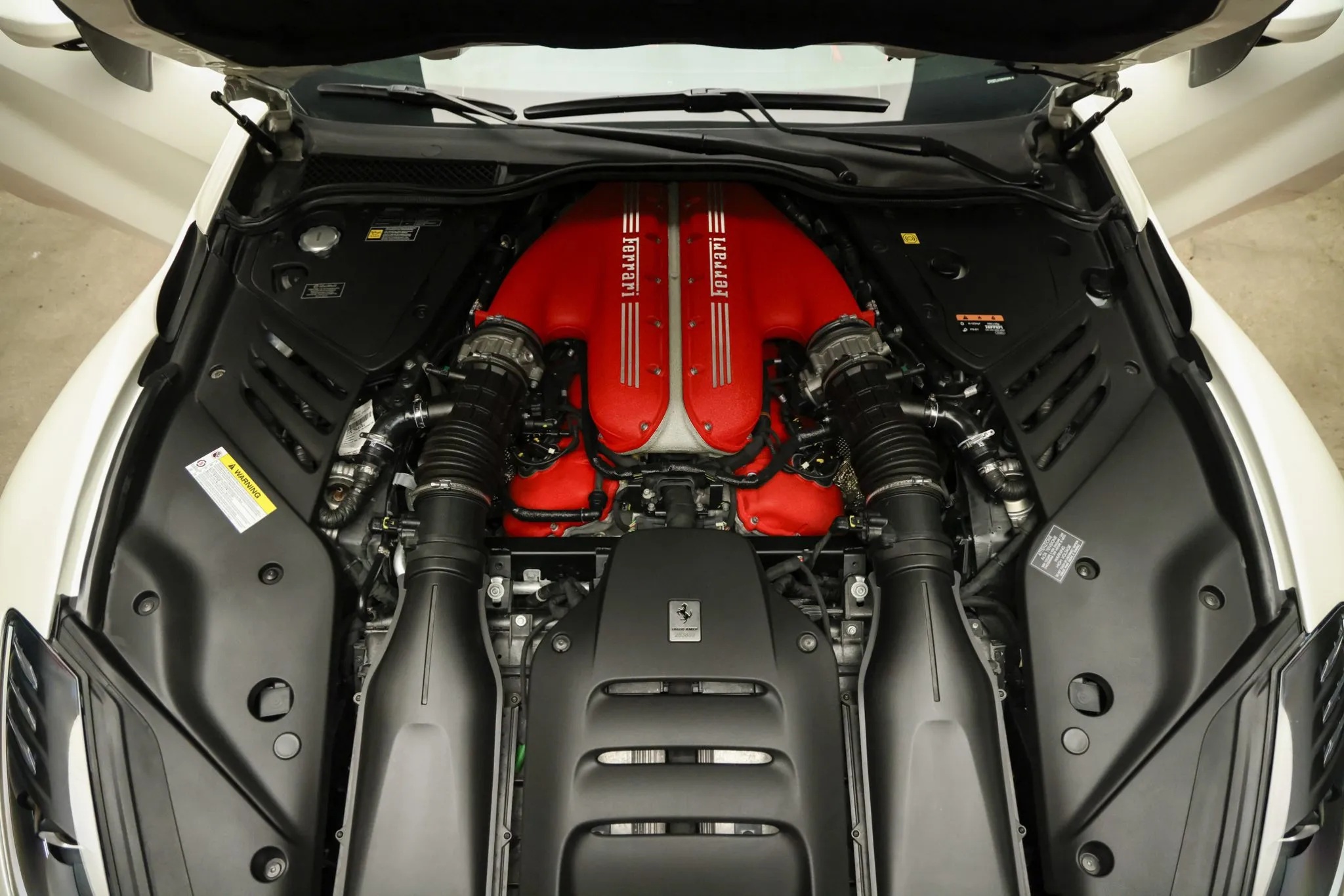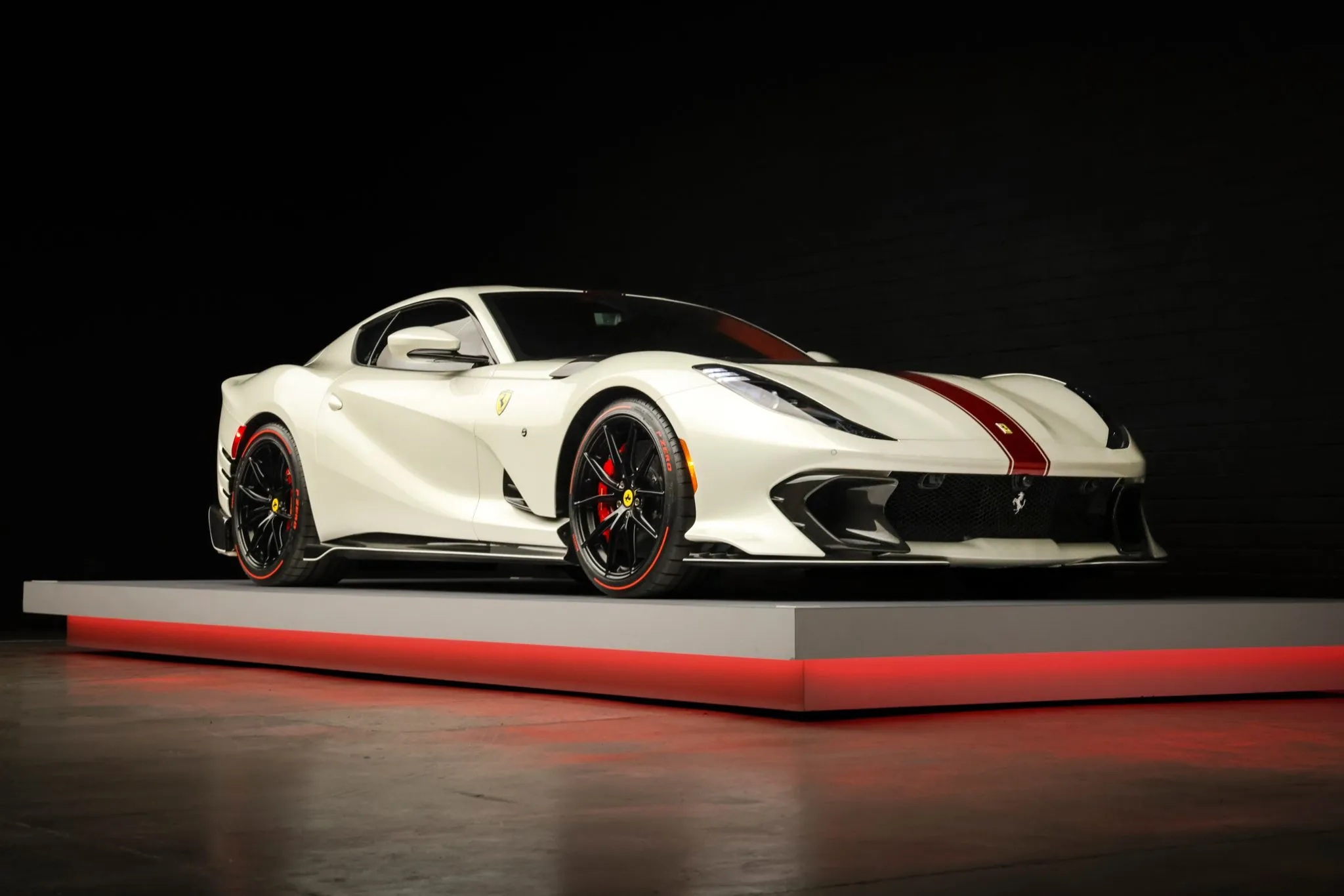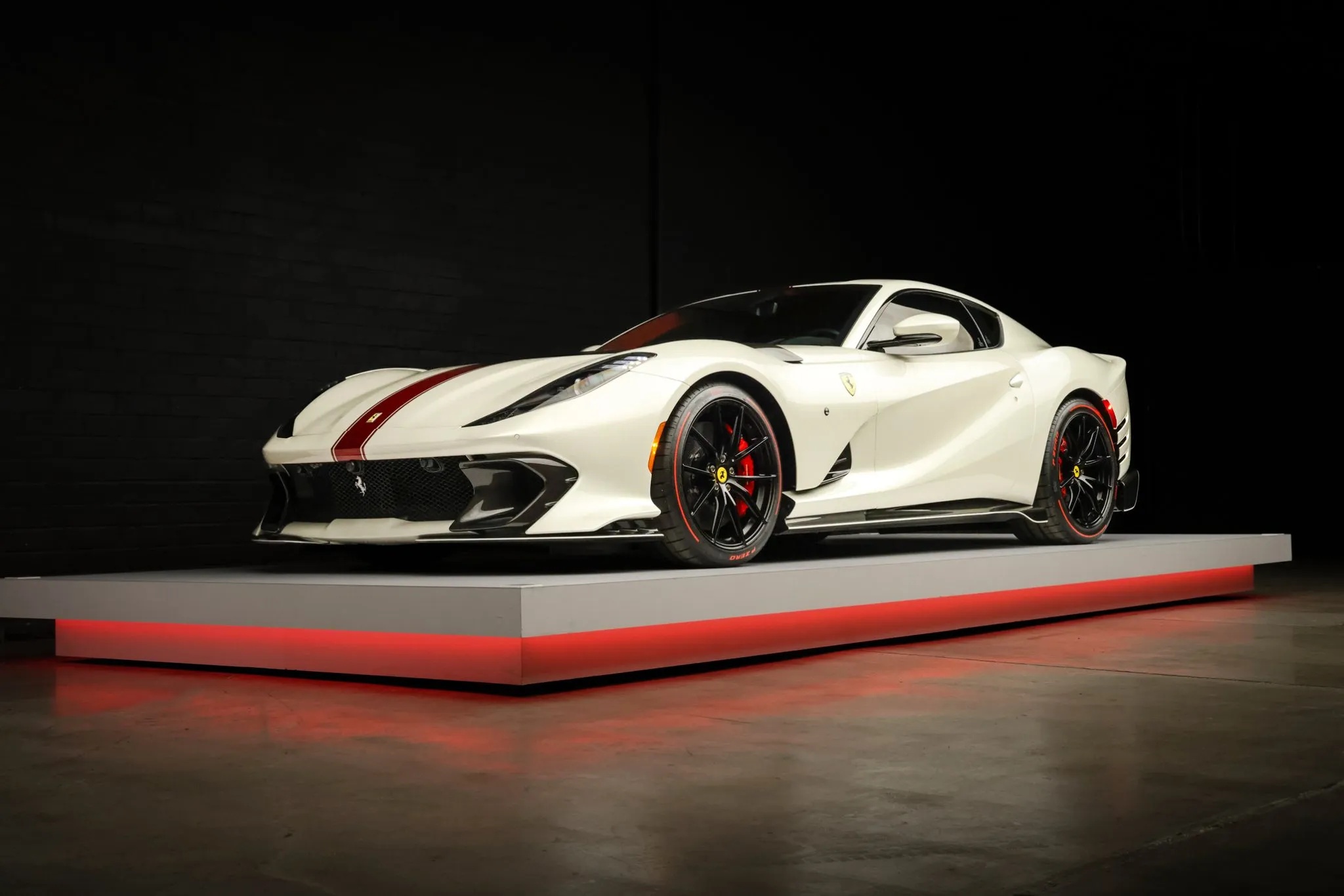 Finished in Bianco Italia accented by a bold Rosso Fuoco central stripe and Scuderia Ferrari shields, the carโs dramatic exterior also serves an aerodynamic purpose. A carbon-fiber blade-style hood, revised intake ducts, an innovative rear screen with six vortex generators, and a meticulously sculpted underbody work together to increase downforce and reduce drag.