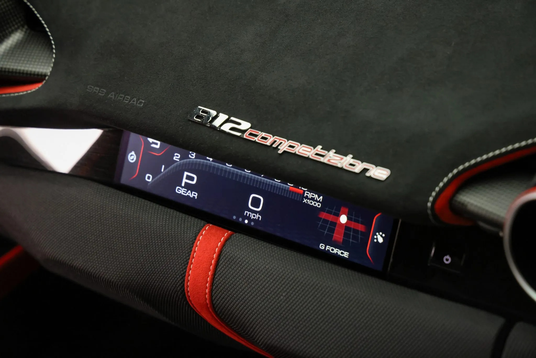 Inside, the cabin features large racing seats trimmed in Rosso Alcantara with checked inserts and Bianco-stitched Cavallino emblems. Rosso Alcantara extends across the headliner, door panels, and center console, while Nero Alcantara covers the upper dashboard. A driver seat lifter, carbon-fiber accents, a JBL Hi-Fi audio system, navigation, and dual-zone climate control round out the interior.