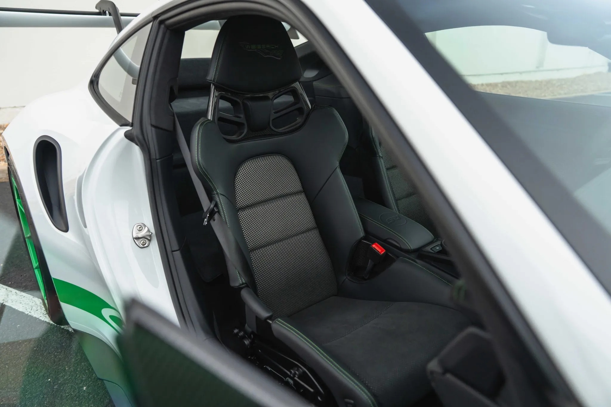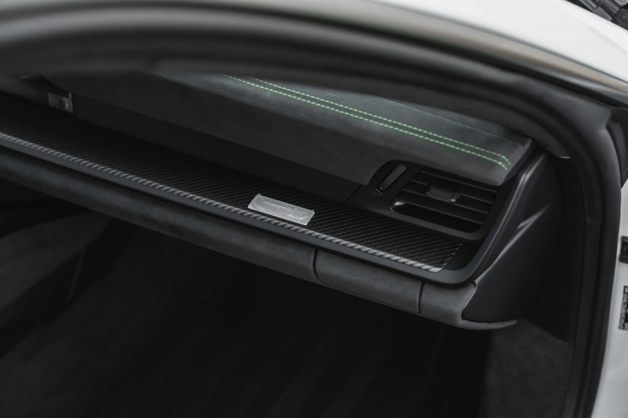 Finished in white with Python Green accents, the car rides on Python Green magnesium center-lock wheels—20 inches in front and 21 inches at the rear—fitted with Goodyear tires. Additional details include Mamba Green deviated stitching, illuminated Tribute door sills, custom green seat inserts with the originals included, and exposed carbon fiber elements throughout.