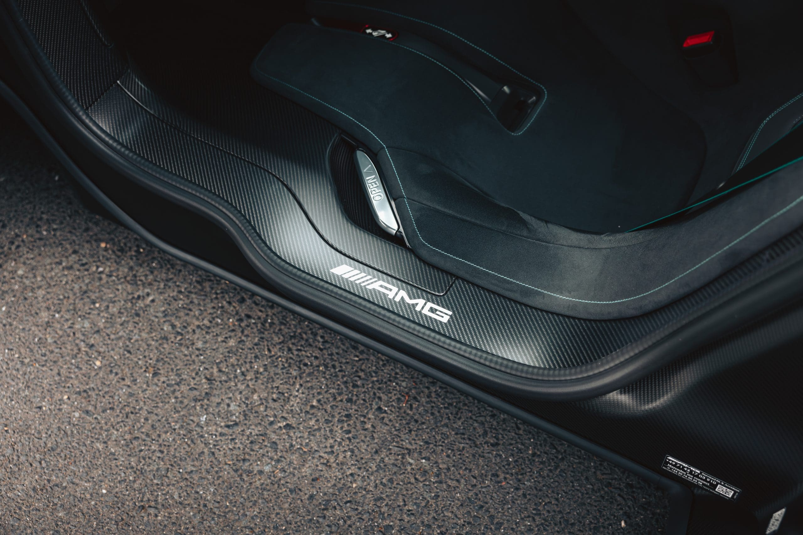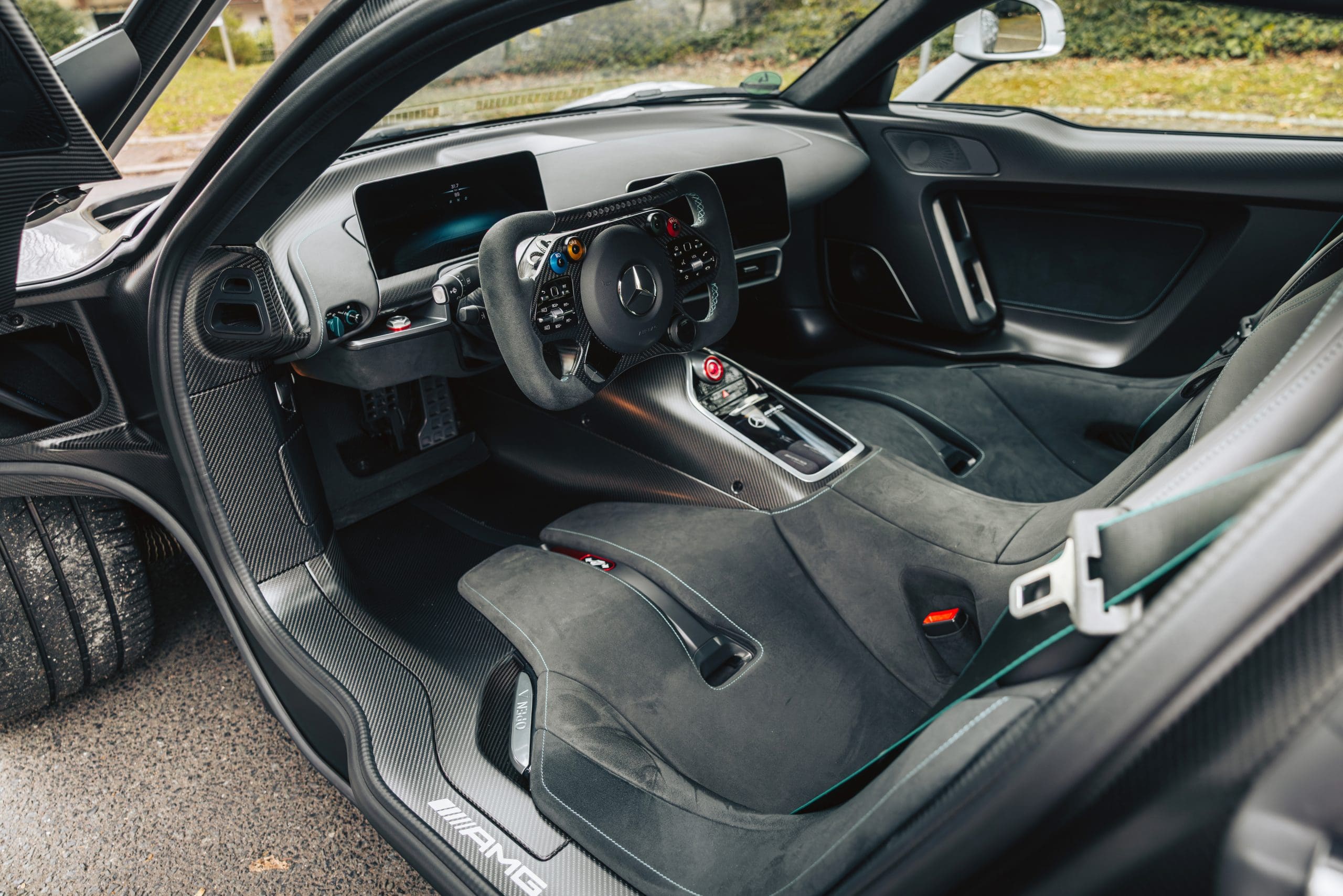 Delivered new in Germany and maintained by a single owner, the car has only 89 kilometers on the odometer. It comes with a full set of accessories, including a custom indoor cover, tools, and exclusive AMG ONE Sennheiser earphones.