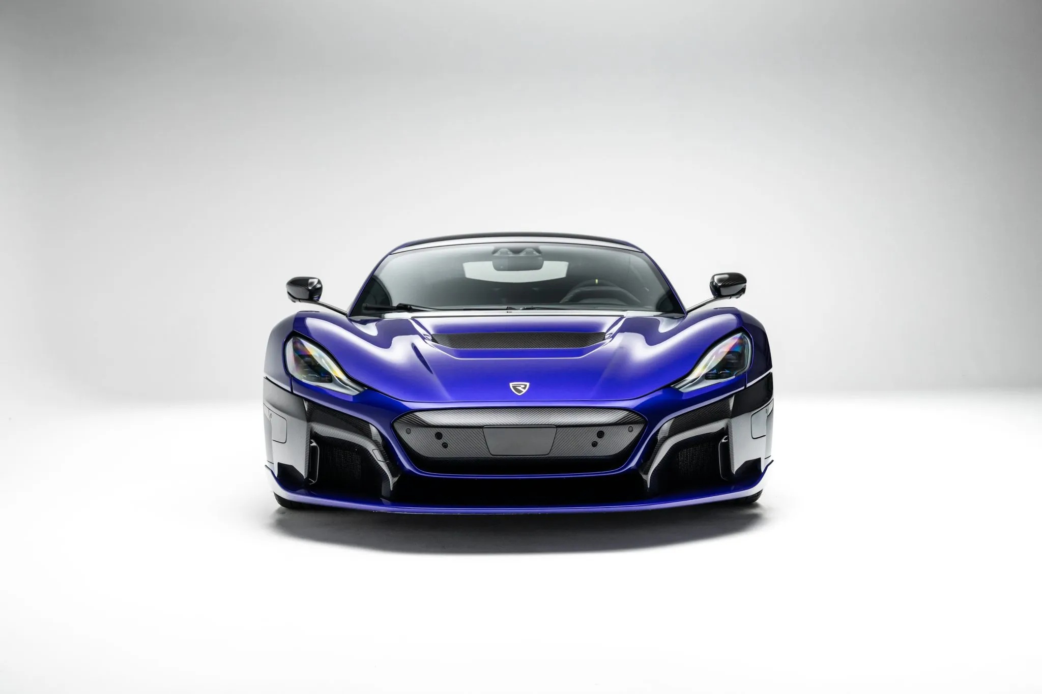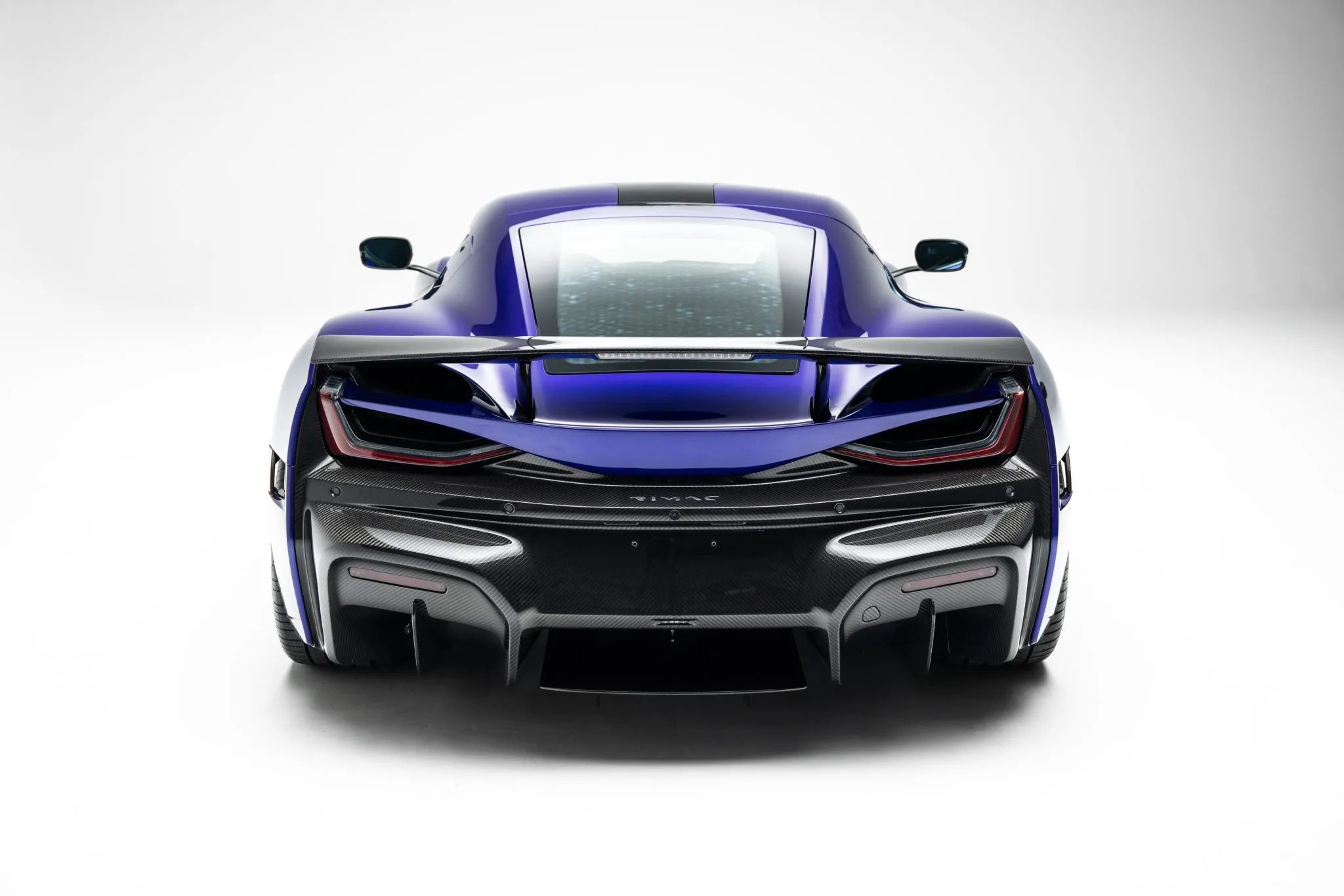 Finished in purple, the car features butterfly doors, carbon-fiber mirrors, and distinctive necktie-shaped side channels inspired by Croatian heritage. Active aerodynamics include adjustable flaps and a rear wing. It rides on black 20-inch wheels with Michelin Pilot Sport 4S tires and features double-wishbone suspension with adaptive dampers. Braking is handled by a brake-by-wire system with six-piston calipers and large carbon-ceramic rotors.