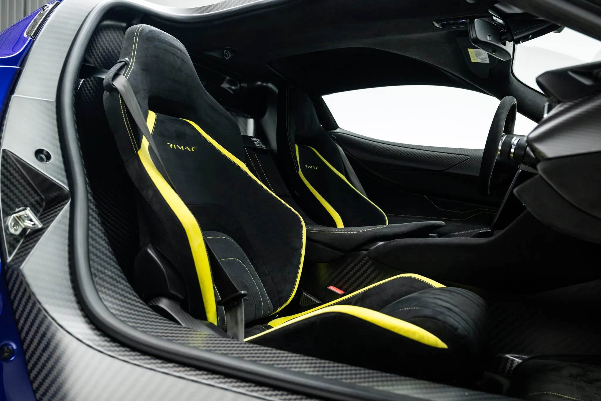 Inside, Alcantara upholstery with yellow accents covers carbon-backed seats and trim, while a touchscreen manages infotainment and telemetry. The quad-motor powertrain draws from a 120-kWh battery, delivering torque to each wheel via independent systems and producing a total of 1,914 hp and 1,741 lb-ft of torque.