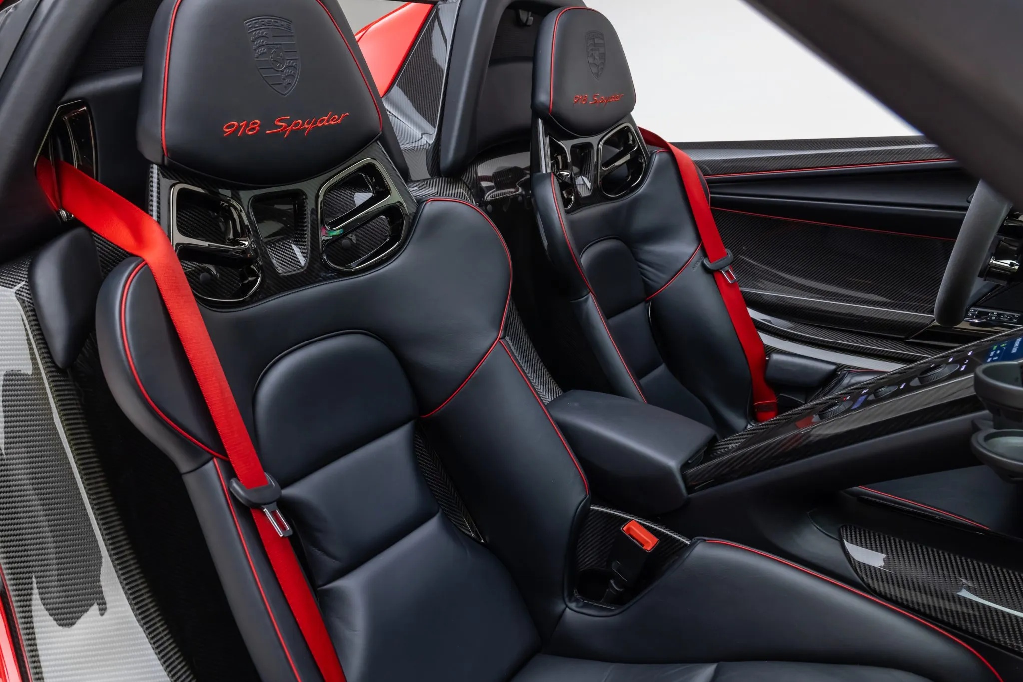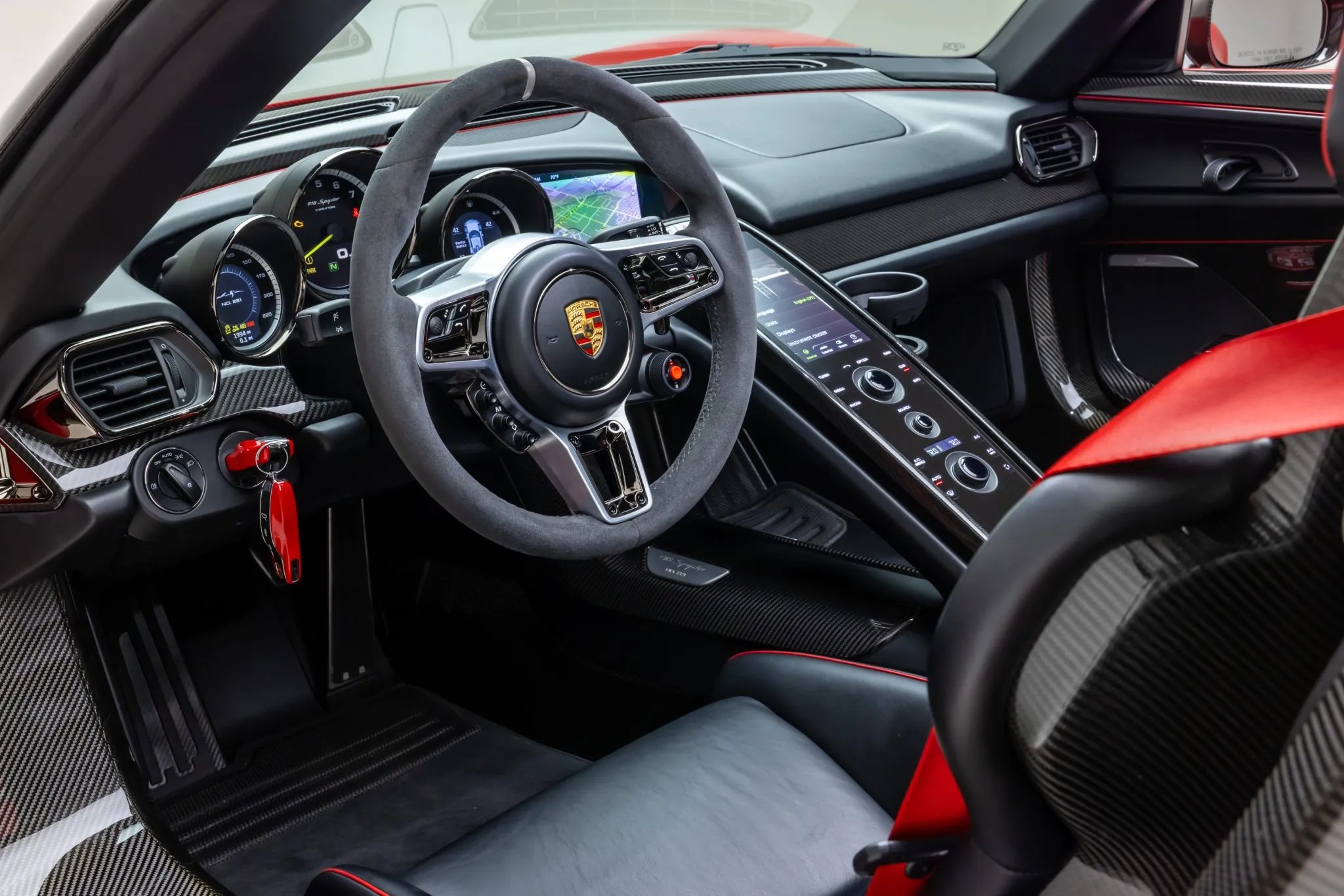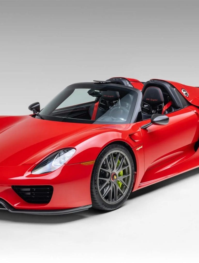 Currently listed on Bring a Trailer, this 2015 Porsche 918 Spyder shows just 1,994 miles and is reportedly one of only four finished in Guards Red for the North American market. It was specified new with the $84,000 Weissach Package, adding enhanced aerodynamics and exposed carbon-fiber elements including the windshield frame, mirrors, roof panels, and extended rear diffuser. The cabin is trimmed in black leather with red piping, complemented by matching seatbelts and door accents.