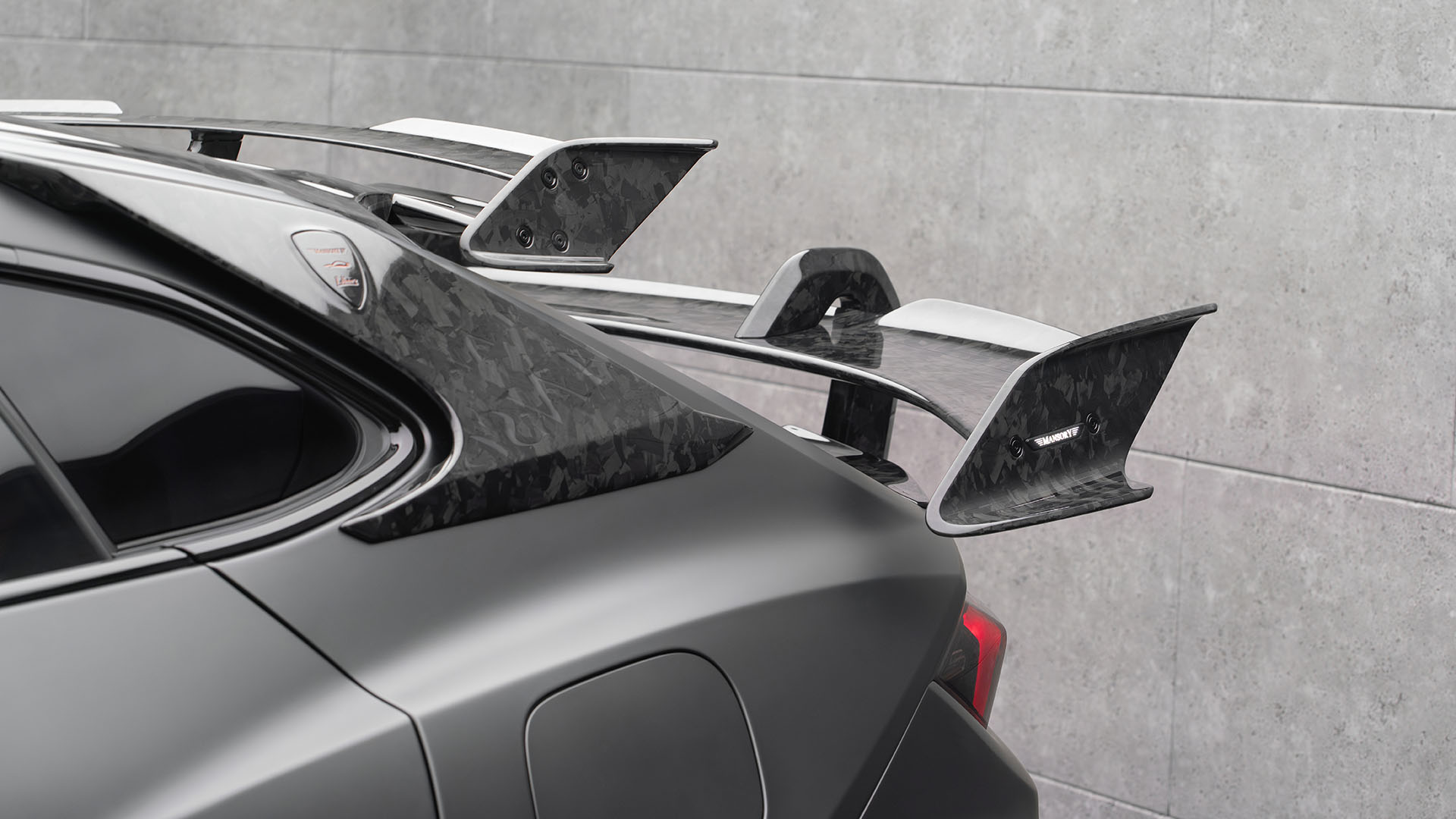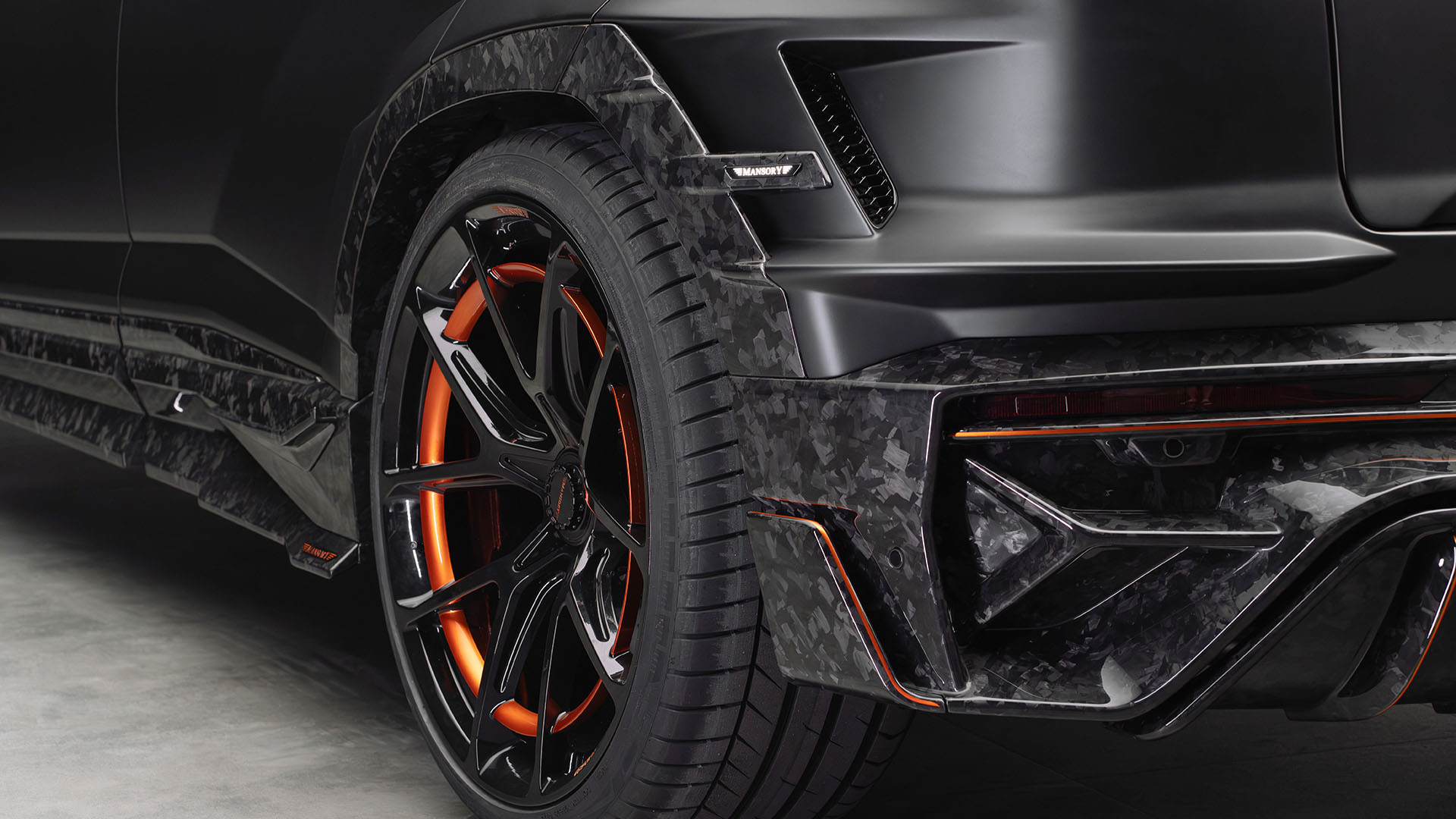 The profile is dominated by newly designed carbon side skirts, giving the SUV a lower and more aggressive stance. At the rear, MANSORY engineers focused on reducing lift, fitting a dramatic double rear spoiler made entirely from carbon fibre. One element sits on the tailgate, while the roof-mounted spoiler is available in two sizes depending on customer preference.