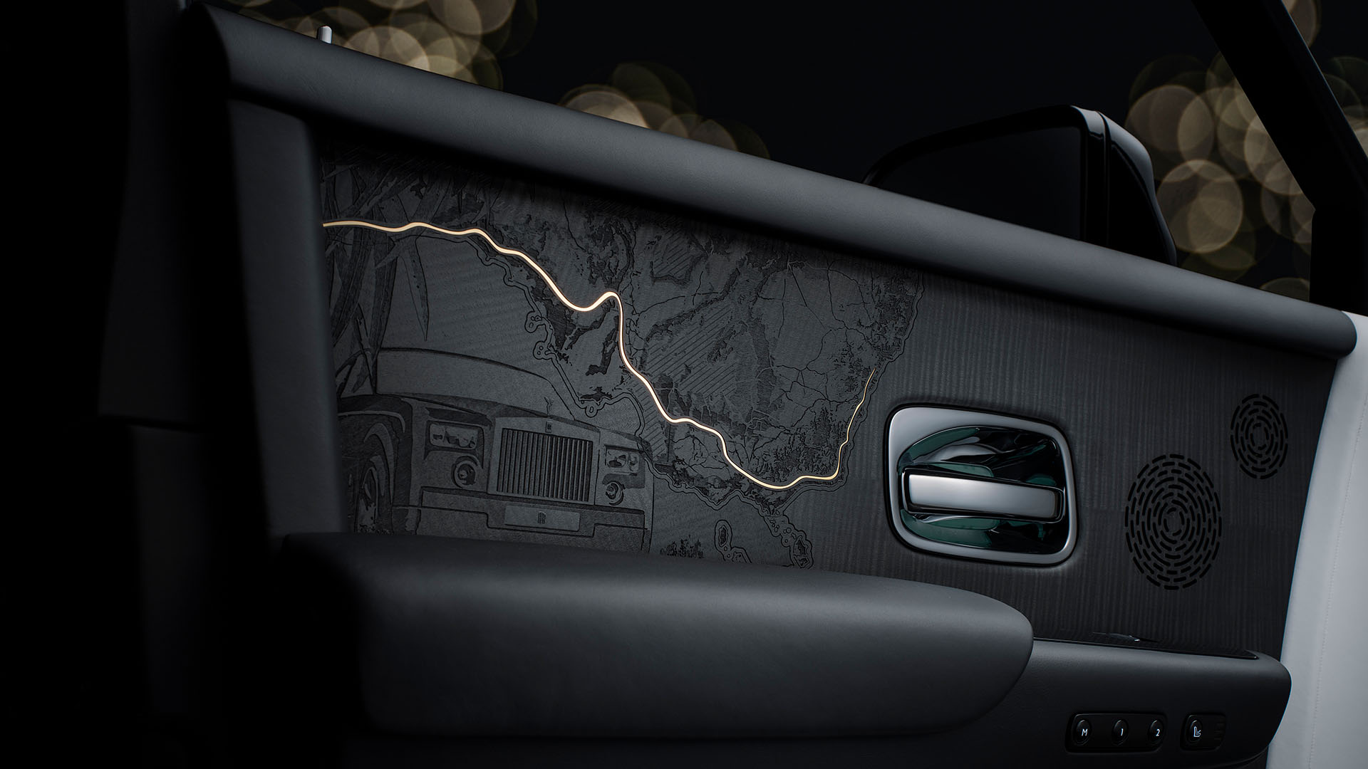 Then thereโs the woodwork, perhaps the most technically ambitious ever fitted to a Rolls-Royce. Crafted from stained Blackwood, the door panels depict key journeys in Phantomโs life โ from the French coastlines where Sir Henry Royce found inspiration to the Australian outback crossed by early Phantoms. Each map route gleams in 24-carat gold leaf, some just 0.1 micrometers thick. The process combines 3D marquetry, laser etching, and ink layering โ a blend of tradition and technology few brands on Earth could pull off.
