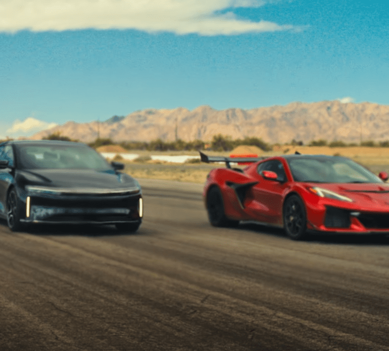 In a drag race filmed by Jason Cammisa for Hagerty, the 1,250-hp Chevrolet Corvette ZR1X challenges the world’s quickest-accelerating production car, the 1,234-hp Lucid Air Sapphire, on regular asphalt rather than a prepared drag strip.